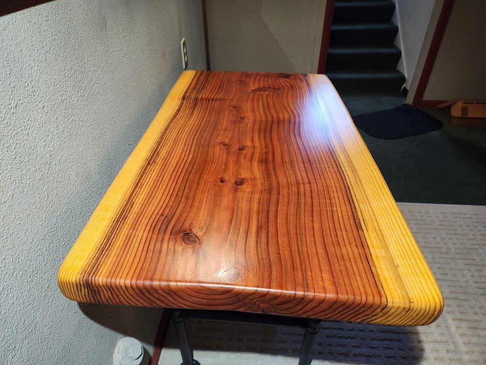 Center cut Redwood 2.50" thick slab. Table measures 40" wide, 24" deep, and 42" high. Industrial pipe legs with flange footings. Gaps are filled with clear epoxy. Delivery available.