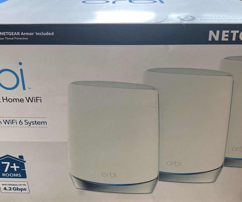 Lightly used Netgear orbi Robust Smart Home Wi-Fi Tri-band Mesh Wi-Fi 6 System. Comes with 1 router and 1 Satellite (Keeping 1). Comes with original packaging. Wi-Fi 4.2 Gbps Model: AX4200 RBK753S (covers 7+ rooms) $480
