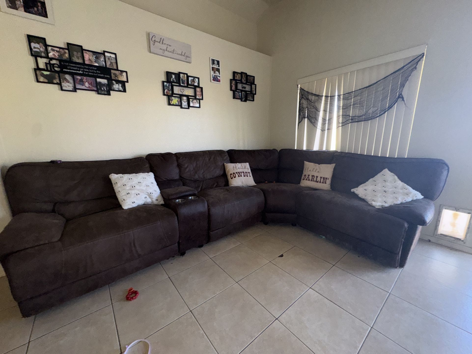 Has been upholstery cleaned 1-2 times a month. In fairly good condition. Three reclining seats, storage compartment and two cup holders. Pillows not included. Is cleaned about once every two weeks. 114inches long side, 76 inches on shorter side Has another section that can be added to it. I don’t have it in as the puppy got to it but still functional without that piece. All recliners work.