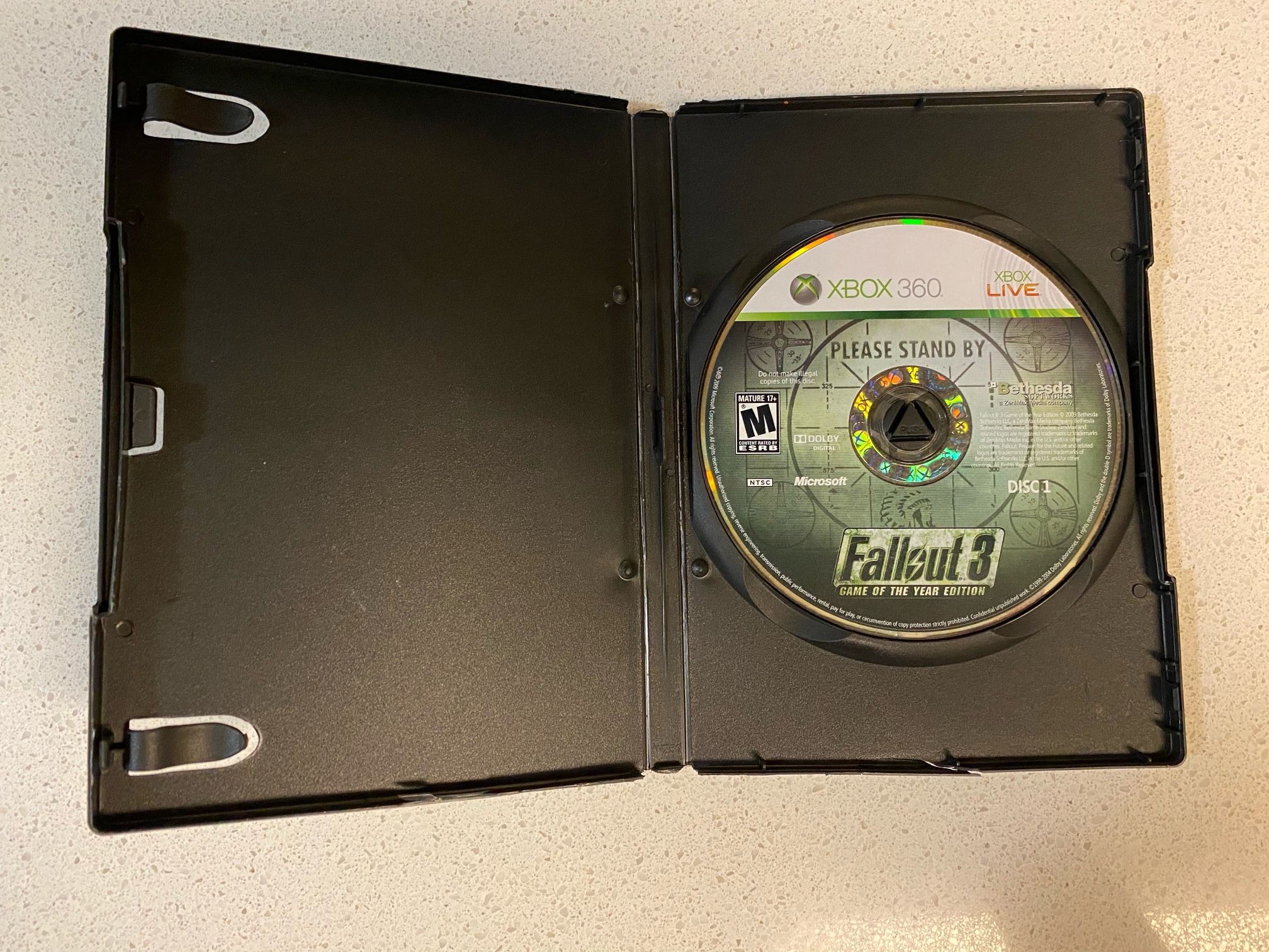 Fallout 3 for Xbox 360, used but it works well. I bought it used and have never played it after testing it.