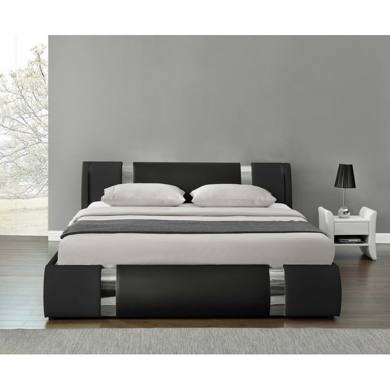 Modern Aesthetic: Features a unique and modern design with artificial leather decoration and iron pieces on the headboard and footboard for a fashionable and intriguing look. Quiet Comfort: Covered in soft PU leather with foam padding tape on wooden slats, ensuring a quieter sleeping experience. Robust Construction: High-density quality steel structure with sturdy, equidistant slats supports up to 800 lbs, enhancing durability and safety. Convenient Assembly: Includes all necessary components in two packages for straightforward assembly with family or friends. Versatile Sizing: Available in Full, Queen, and King sizes, with specific dimensions provided for each, and does not require a box spring. 5658-3