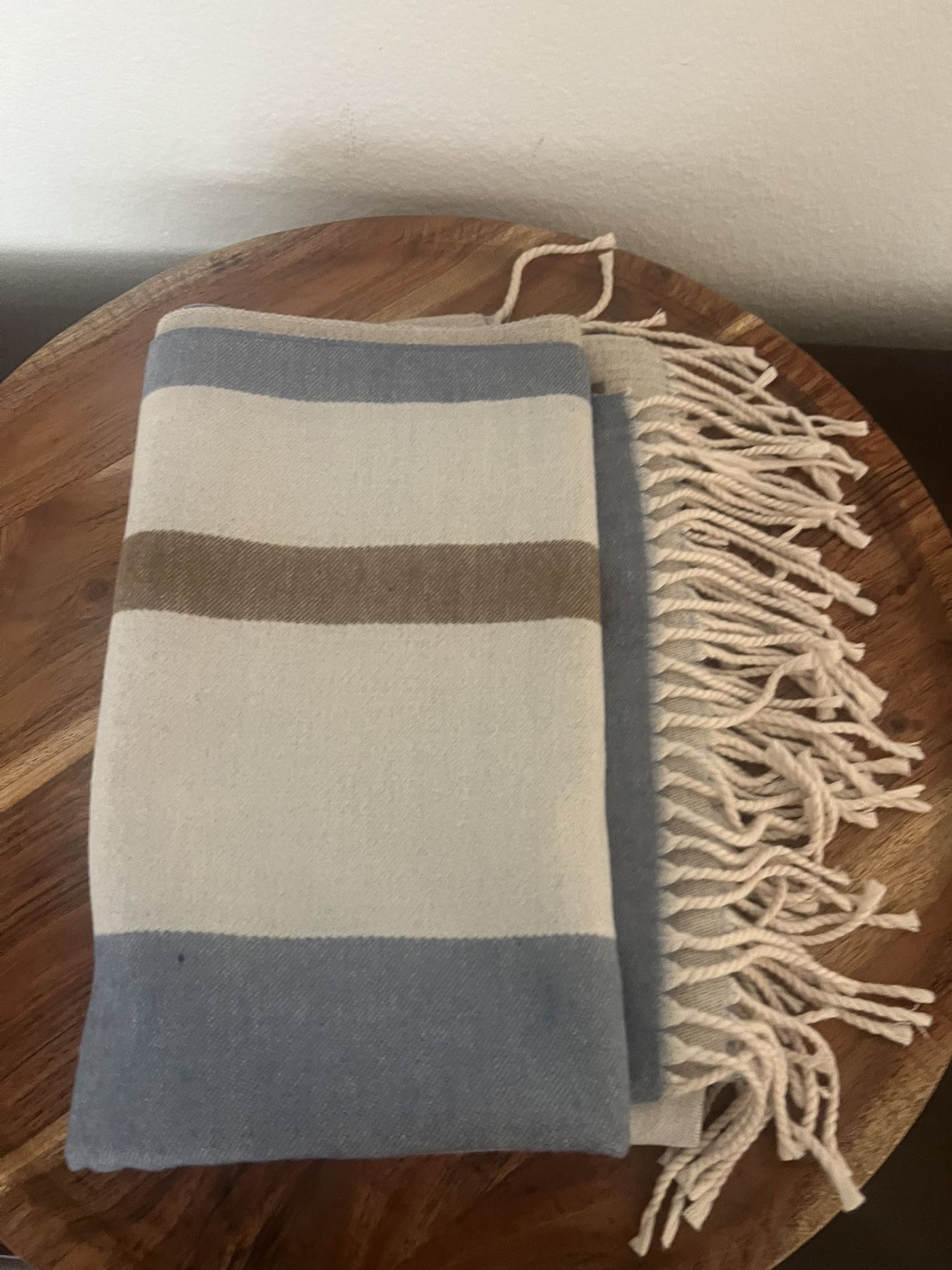 This 100% cashmere Tri colored wrap is a beautiful and warm accent. Classic color of beige blue and brown scream luxury.