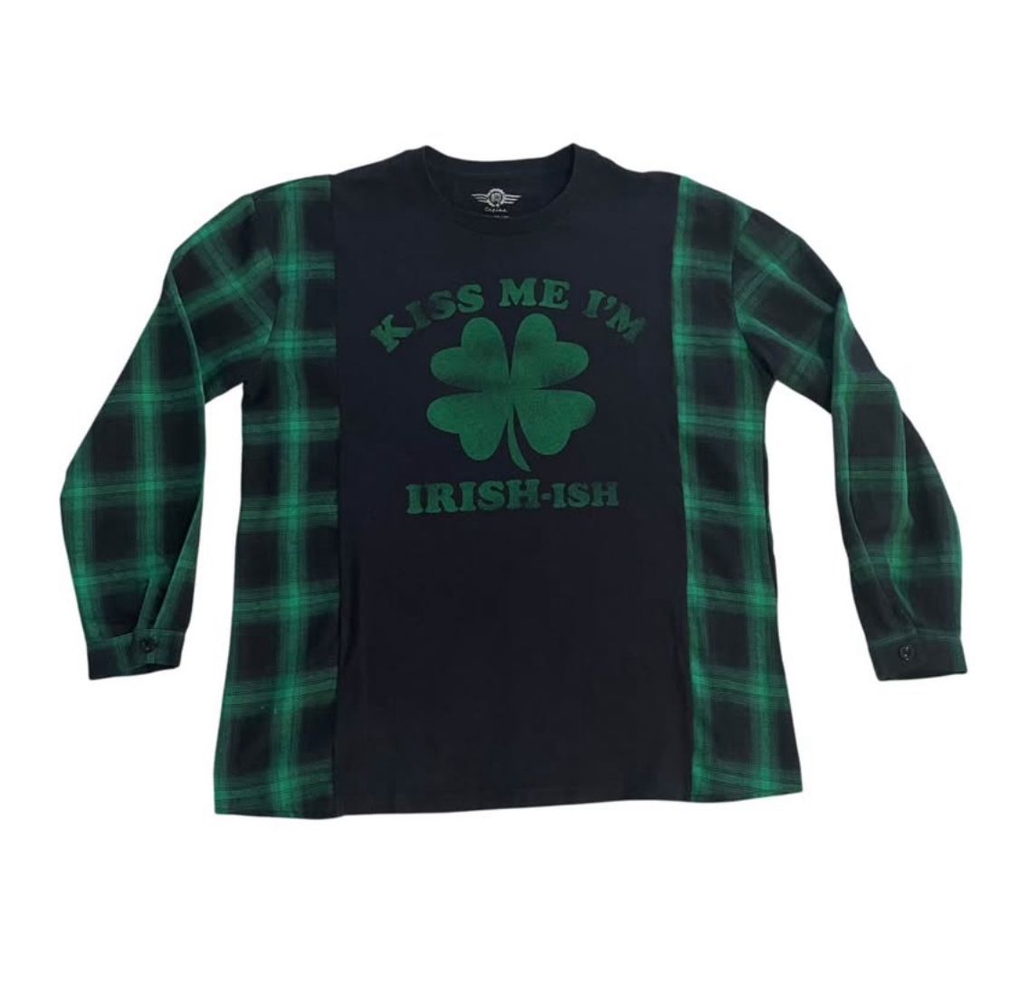 Kiss Me I’m Irish-ish Four Leaf Clover Green Black Flannel Sleeve Tee Shirt XL