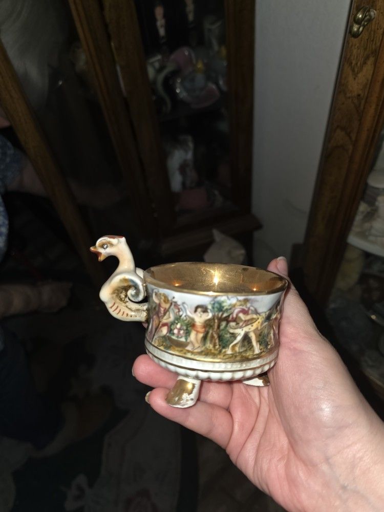 Beautiful antique porcelain cup featuring an ornate swan-shaped handle and classical mythological scene with dancing figures. The interior is finished with a rich gold glaze, and the cup rests on three small pedestal feet, giving it an elegant European cabinet display look. • Antique European porcelain cup • Swan neck handle design • Hand-painted classical mythology scene • Gold gilt interior • Three-foot pedestal base • Decorative collectible display piece A stunning decorative piece perfect for collectors of antique porcelain, classical art motifs, or European cabinet display items.