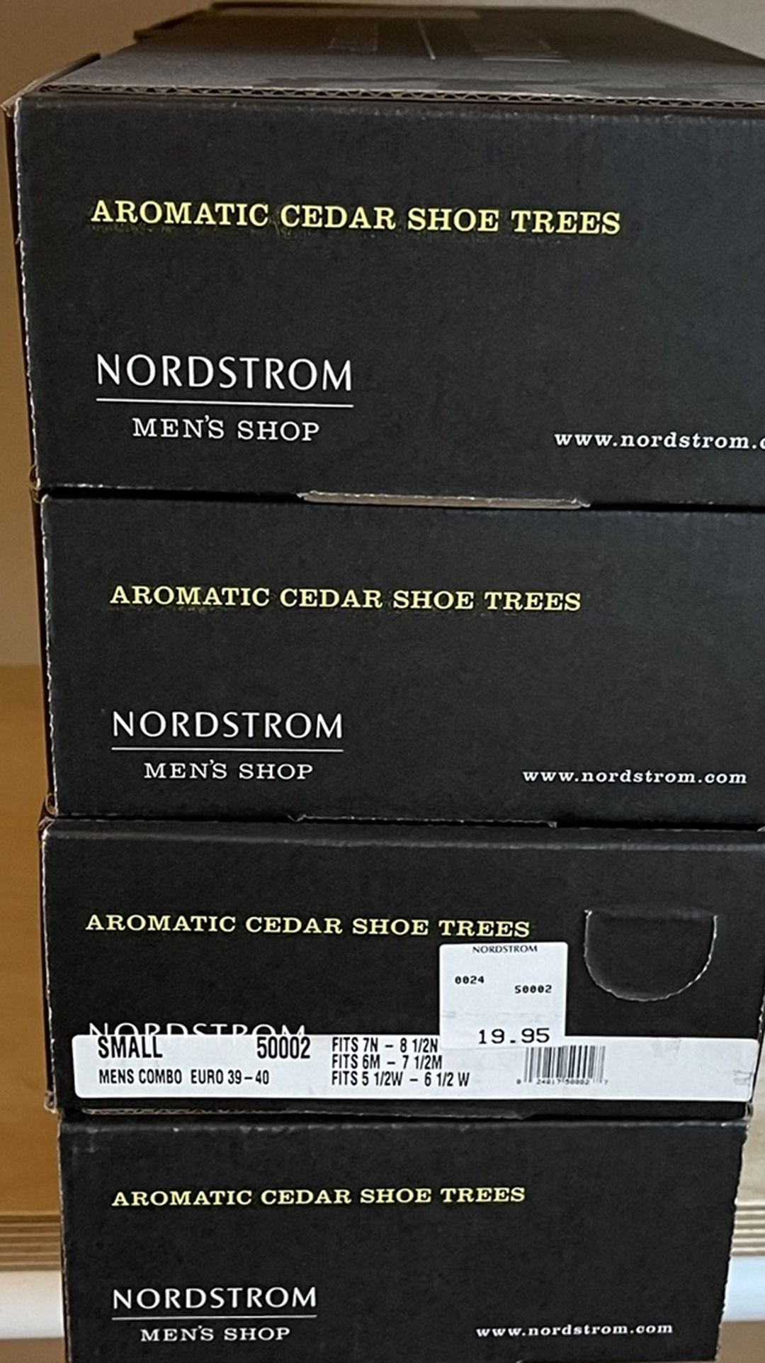 I have four unused, boxed trees. And two that have been open and used. Therefore a total of six pairs of shoe trees. All size small. They’ll fit a size 7 to 8.5 narrow. 6 to 7.5 medium. 5.5 to 6.5 wide. They retail for $20 each. Price listed is for each pair of shoe tree. Stored in a non smoking household.