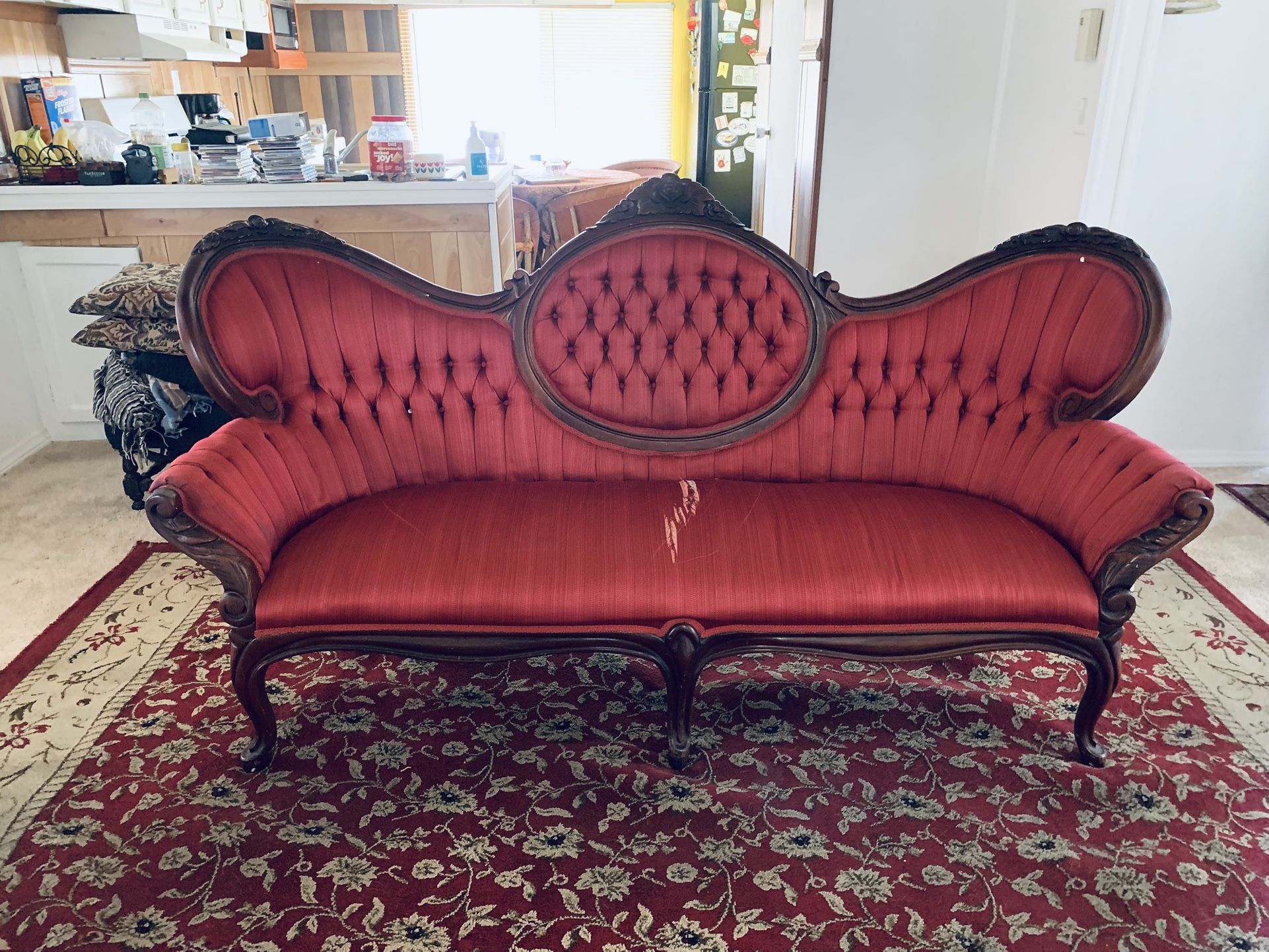 Absolutely beautiful antique couch/ sofa. Needs reupholstery done, see pics. This is not the original upholstery. The frame and cushions are in beautiful sturdy condition. With new upholstery, this couch will easily sell for over $1000! Located in El Cajon. Asking $400 obo Wing to wing is 79” Arm to arm is 75” Seat depth 21” Total depth is about 30” Max height 40.5” Seat height is about 15”