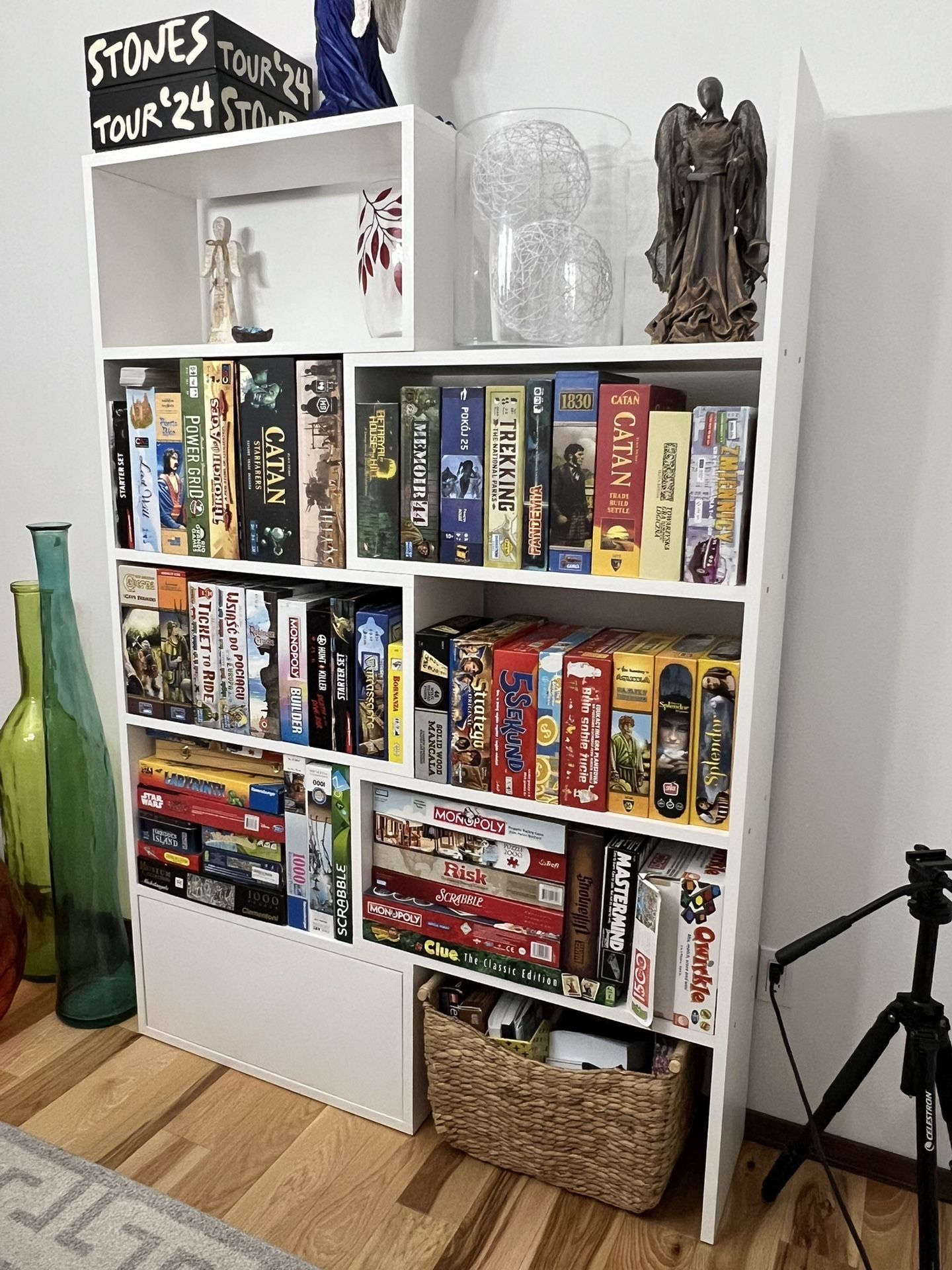Like new. approximately 54w x 74h x 11.5d. two parts are interlocking so width can be smaller. can also be a corner. (games not included)