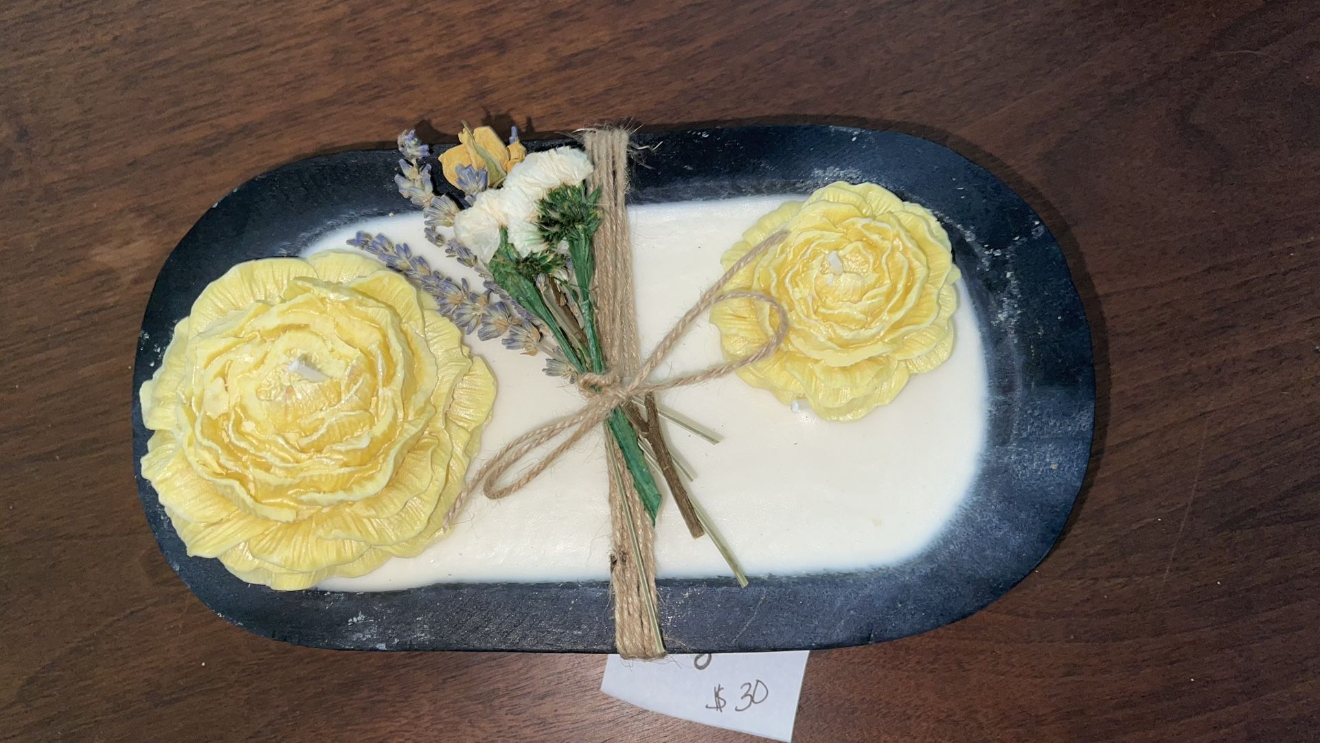 Beautiful dough bowl candles great for gifts and holiday hostess gifts. 9.5” 3 wicks Two tea light candles 14” 5 wicks 3 tea light candles Scents: vary from white Christmas, holiday spice, candy cane and black orchid.