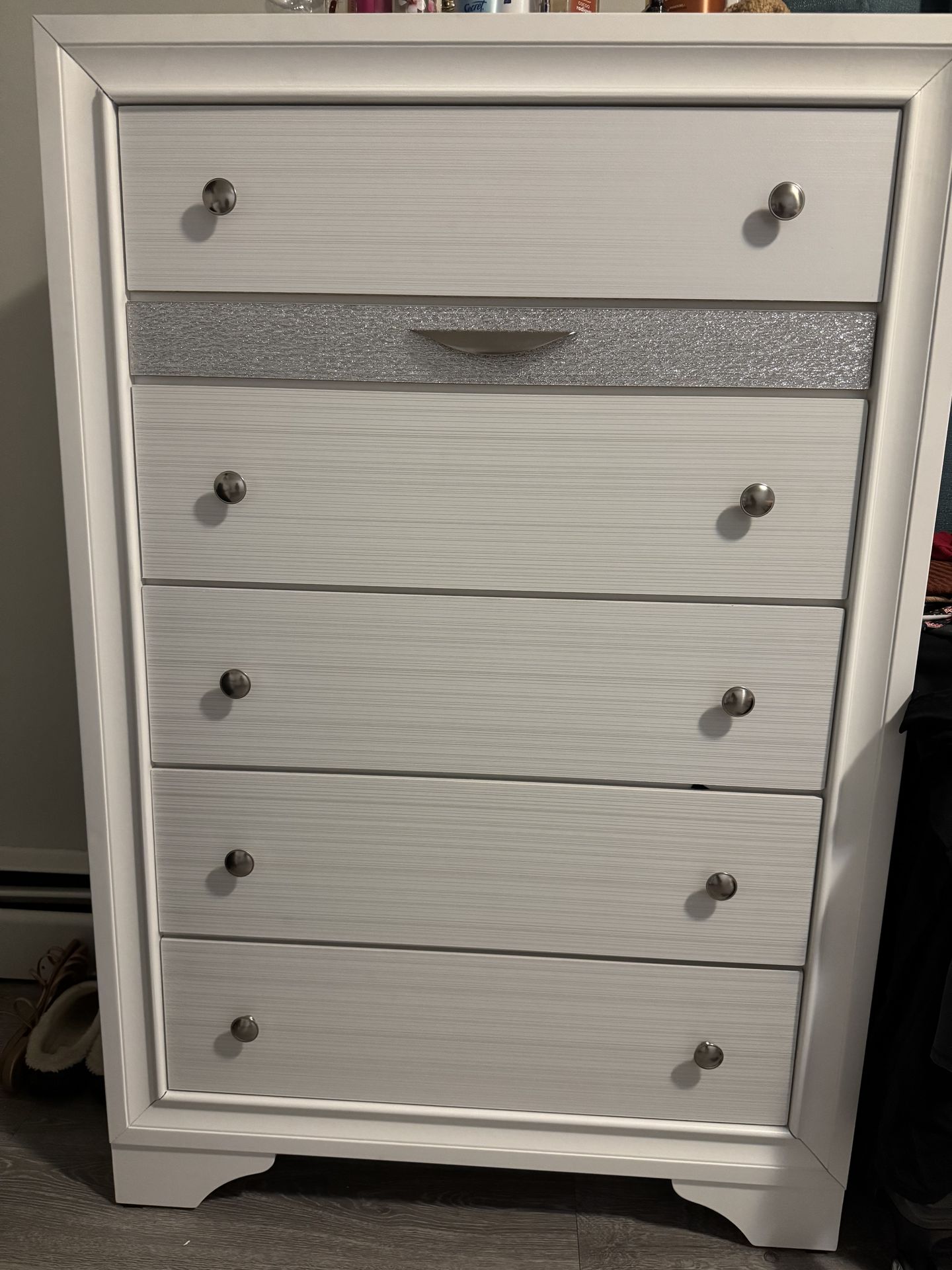 Beautiful bedroom set for sale including: • Queen size bed frame with storage drawers • Dresser with mirror • Nightstand Condition: Very good, clean, no major damage. Color: White with silver accents (modern style) Pickup only. Located in Haverhill, MA Message me if interested