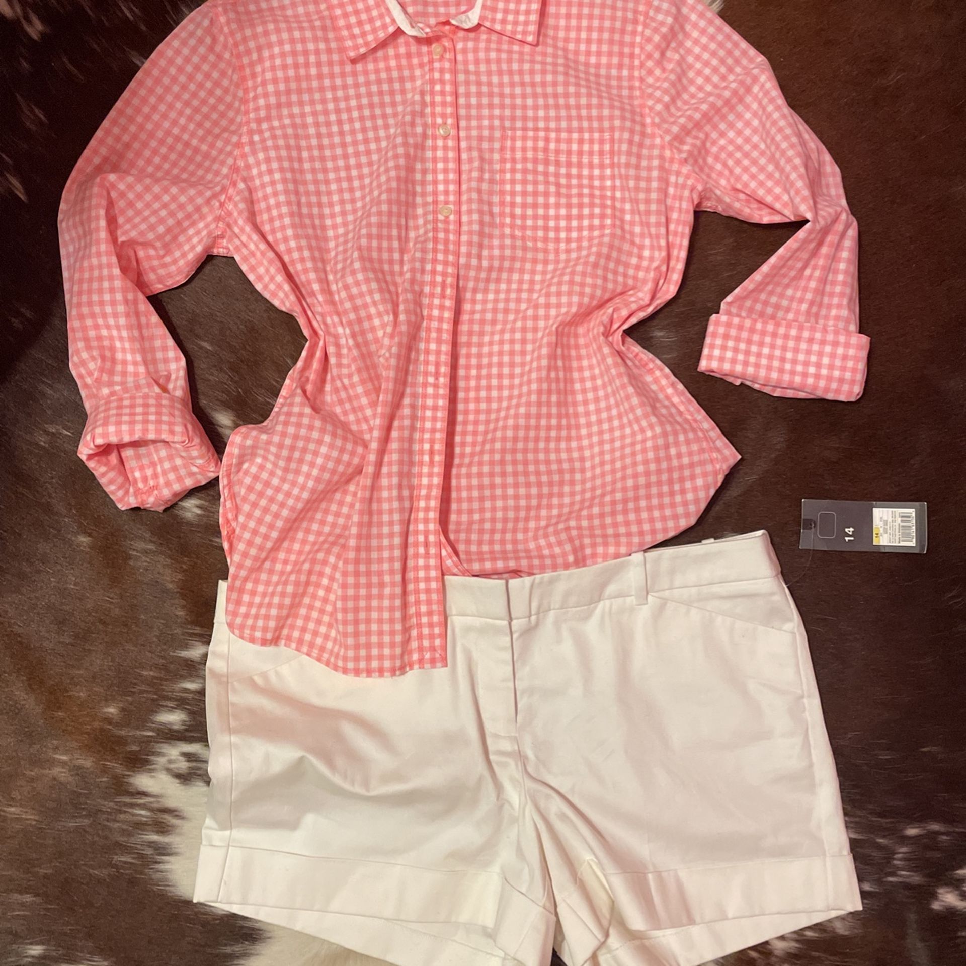 New with tags White shorts mossimo sz 14 $8 New with tags pink gingham button up shirt sz Large $10
