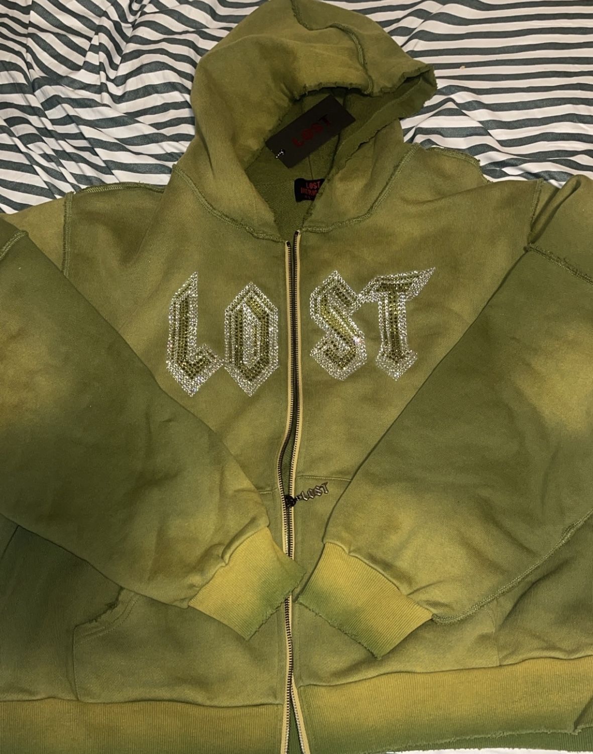 Size 2x Army Green Lost Intricacy Hoodie Fits like an XL Yellow And Clear Stones on LOST wording Distressed on hood and wrist area