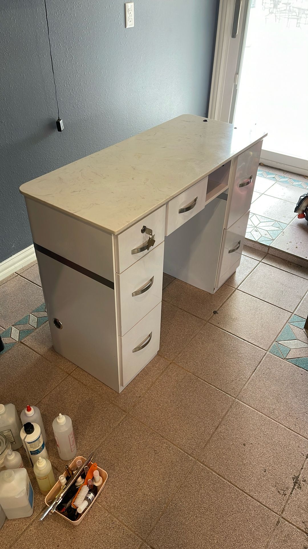 Great condition desk for nails. There is a picture for every angle! 4 deep drawers & 2 top drawers. One with keys! Cubby space. The drawers are soft close. The counter top marble. You can move it but it’s very heavy. There is very light scuffs on counter which i think can be removed. The desk itself is heavy & sturdy. There is a outlet at the bottom (check pictures) it connects to the cubby space so you can put your drill! Or any other connection. Everything is in great condition. I’m also selling nail products but there almost all gone so checkout my page
