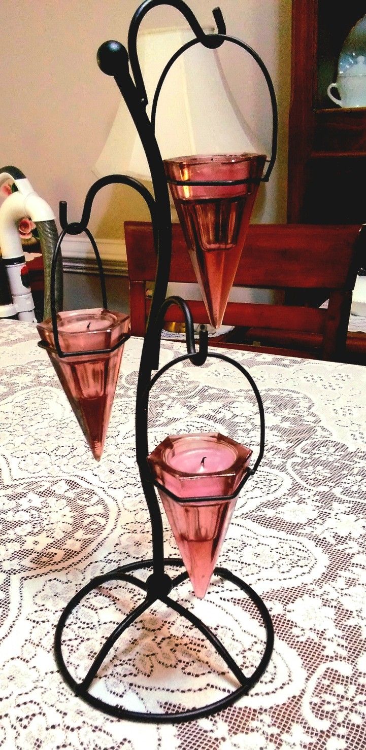 This is a beautiful candle holder with 3 amethyst glass votives. No chips or cracks. Just lovely.