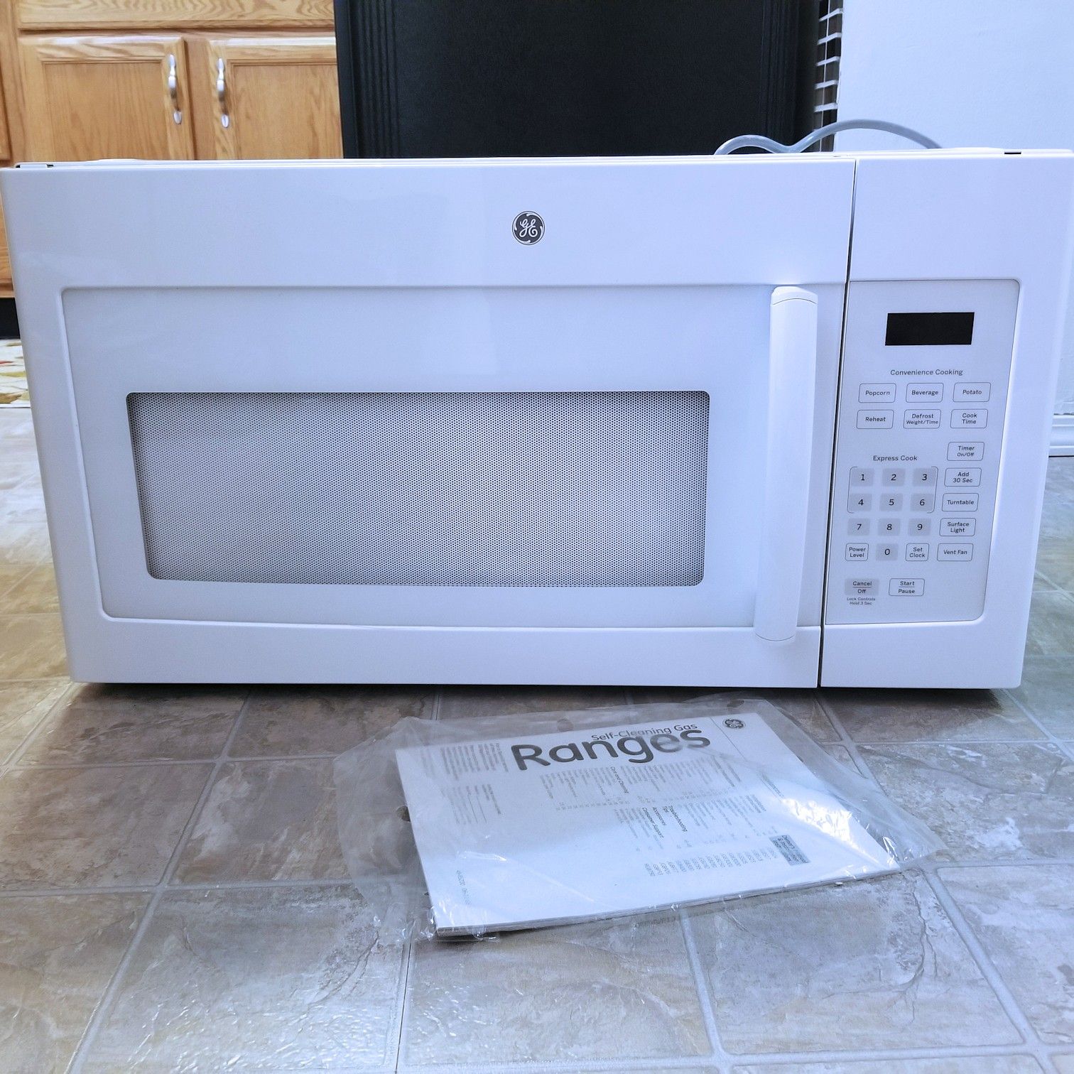 Used for about 3 Month & we ended up buying a Stainless Steel new microwave to match our stove. EASY 9 OUT OF 10 CONDITION Dimensions: Width : 29.88 in. Turntable Diameter : 13.5 In. Height : 16.5 In. Depth : 15.25 In. Interior Dimensions : 9.25" H x 18.81" W x 14.41" D HxWxD Depth with Door Open : 39.75 in. Appliance Features: Extend Cook: 30 Seconds Door Release: Pull-to-open Defrost: Yes Maximum Microwave Cooking Time : 99.99 min. Number of One-Touch Settings: 6 Safety: Child Lock: No Power & Performance: Wattage: 1000 Color Family: White Capacity: Interior Capacity: 1.6 cu. ft. Exhaust Fan Air Flow : 300 CFM General Features: Turntable: Removable Weight : 63 lbs. Styling: Door Swing: Microwave Power Levels: 10 Heating Type: Microwave Venting: Vented Description 1.6 cu. ft. Capacity 1,000 Watts Auto and Time Defrost Two-Speed Venting System Spacious 1.6 cu. ft. capacity 1,000 watts of power Convenient cooking controls make operating quick and easy Auto and timed defrost are programmed automatically or manually for optimal results Turntable on/off controls Two-speed, 300 CFM venting system removes smoke, steam and odors MINT Condition General Electric Over The Range Microwave Oven Easy 9/10 Condition