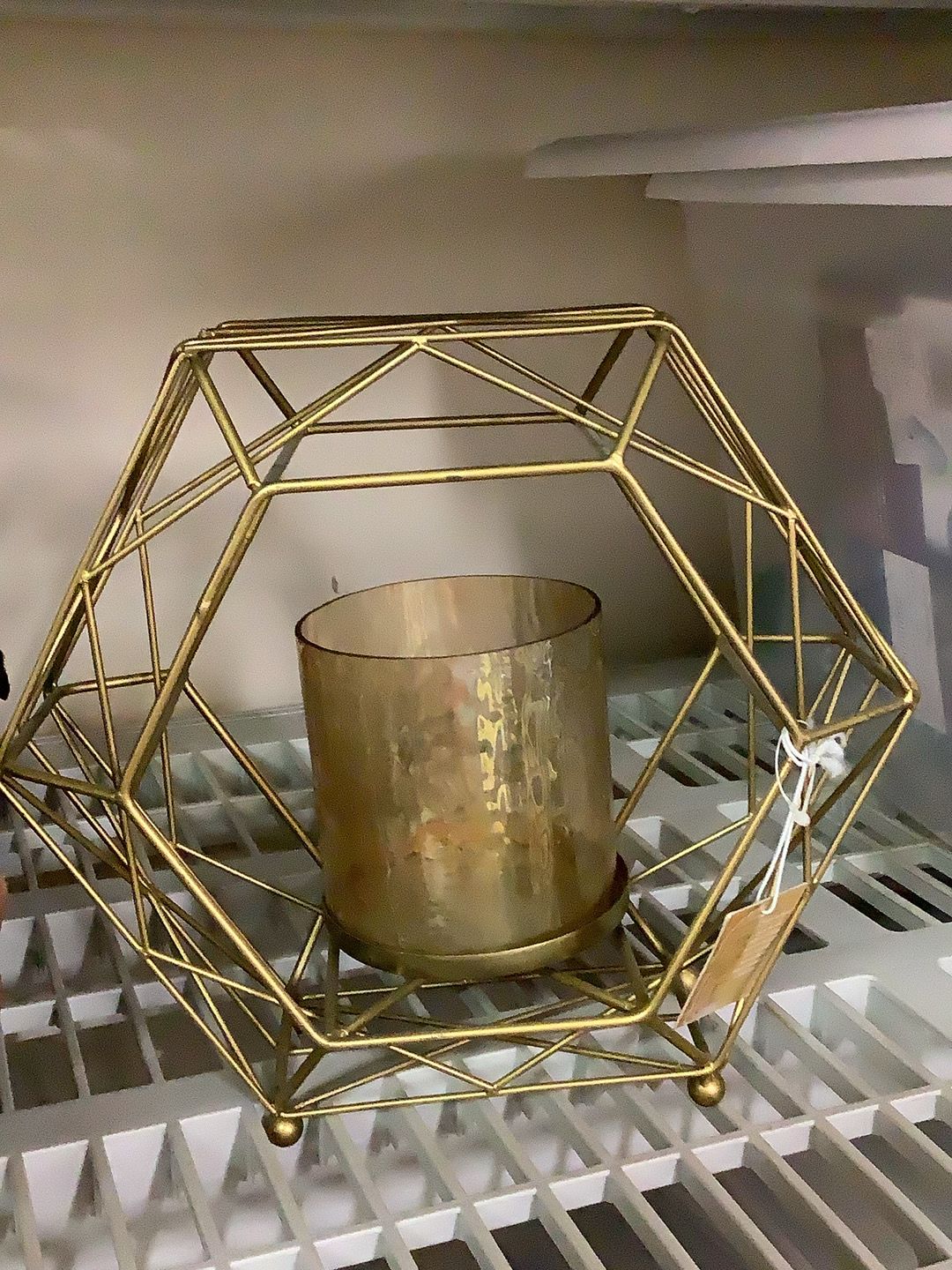 Uttermost Myah Geometric Gold Candleholder, featuring an open iron frame finished in antique gold with a luster glass globe.