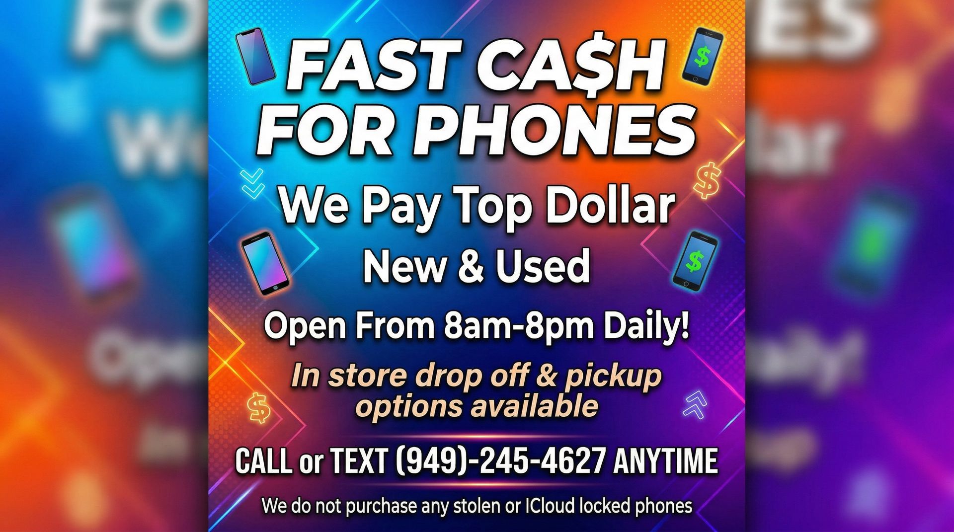 📱 THE PHONE PROS FA$T CA$H FOR PHONE$ We Pay Top Dollar Fast • Easy • Same-Day Cash ⸻ WE BUY: • iPhones (7 – Latest) • iPads • MacBooks (2020 – Latest) • Samsung (S Series • Z Fold • Z Flip) • Google Pixel New & Used — Any Condition • Unlocked • Financed / Carrier Locked • Broken ⸻ OPEN DAILY: 8AM – 8PM CALL OR TEXT ANYTIME (949) 245-4627 Free Quotes in Minutes ⸻ In-store drop-off & pickup available ⸻ IMPORTANT: We do NOT purchase stolen or iCloud locked devices ⸻ Get Paid Today — No Games, No Lowballs Sell iPhone near me iPhone buyers Phone buyer Cash for phones Sell my phone Cash 4 phones iPhone Buyer near me Phone buyer near me Sell my iPhone iPhone 7 IPhone X IPhone 11 12 13 14 15 16 17 12 Pro 12 Pro Max 13 Pro 13 Pro Max 14 Pro 14 Pro Max 15 Plus 15 Pro 15 Pro Max 16 16 Plus 16 Pro 16 Pro Max 17 17 Air 17 Pro 17 Pro Max 17 E S23 S23 Ultra s24 s24 Ultra s25 s25 Ultra s26 Ultra Samsung s26 Google pixel 10 pro xl Google 9 pro 8 IPad M4 M5 WiFi WiFi + cellular A17 a16 10th gen MacBook MacBook Pro 16” 13” 13 inch 16 inch 15 inch 11 inch 11”