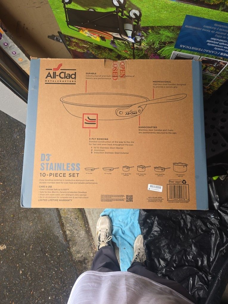 The All-Clad D3 stainless 10-piece cookware set, available at retailers like Macy's and All-Clad's official site, features tri-ply bonded construction for even heating. The set typically includes fry pans, saucepans with lids, a sauté pan with a lid, and a stockpot with a lid. It is oven-safe up to 600°F and compatible with all stovetops, including induction.