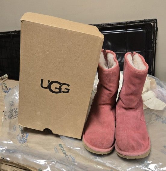 Authentic Ugg pink suede boots. Very good condition. No stains, water marks, spots or damages. The bottom soles looks new barley worn. Inside fur clean and fuzzy. A nice stand out pink! FITS ladies size 5 or Girls size 3.