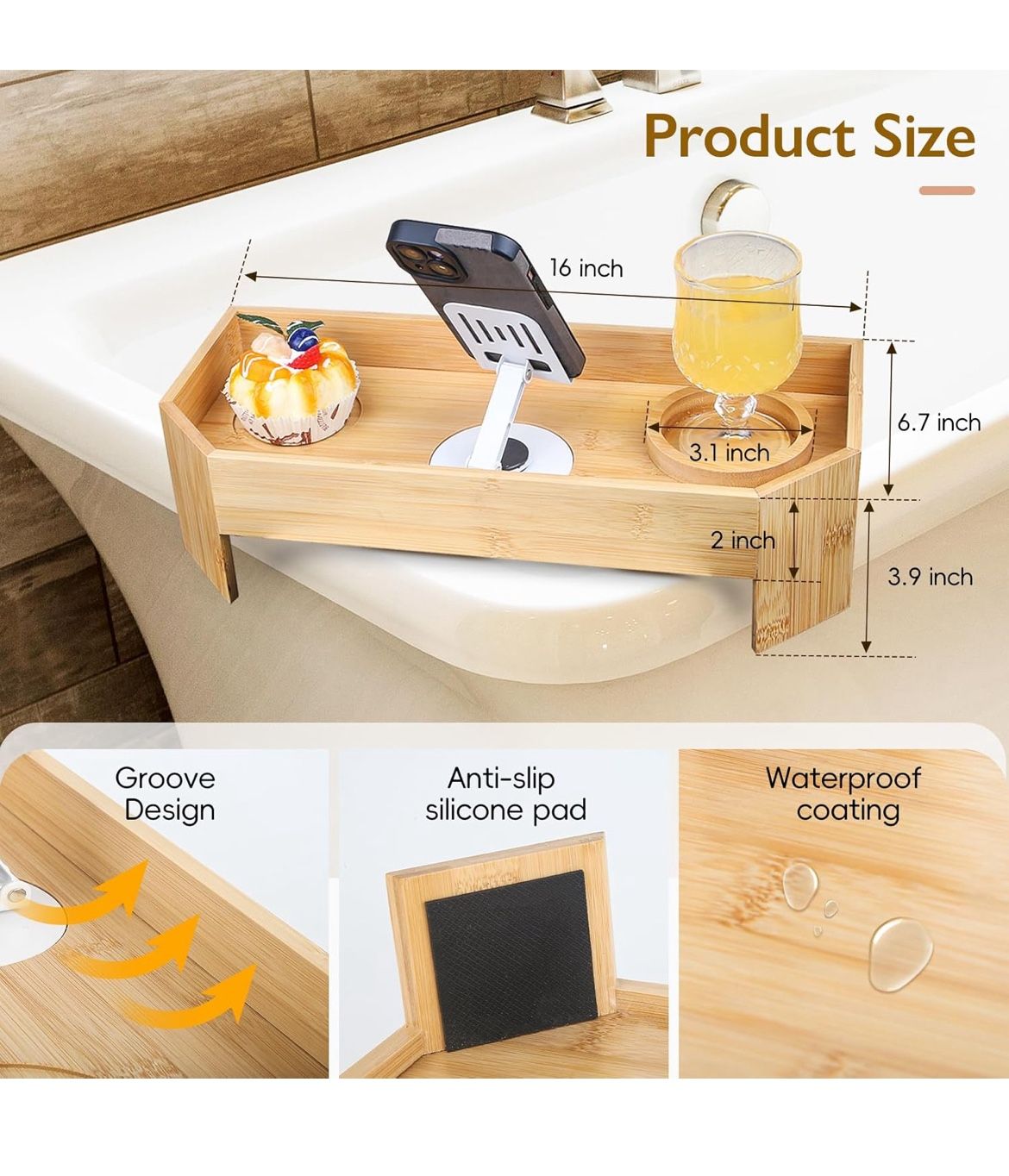 Bamboo Hot Tub Tray with Phone Slot Waterproof Bath Tub Tray Wood Non-Slip Side Table & Beverage Holder for Hot Tubs & Bathtubs for Drinks and Essenti