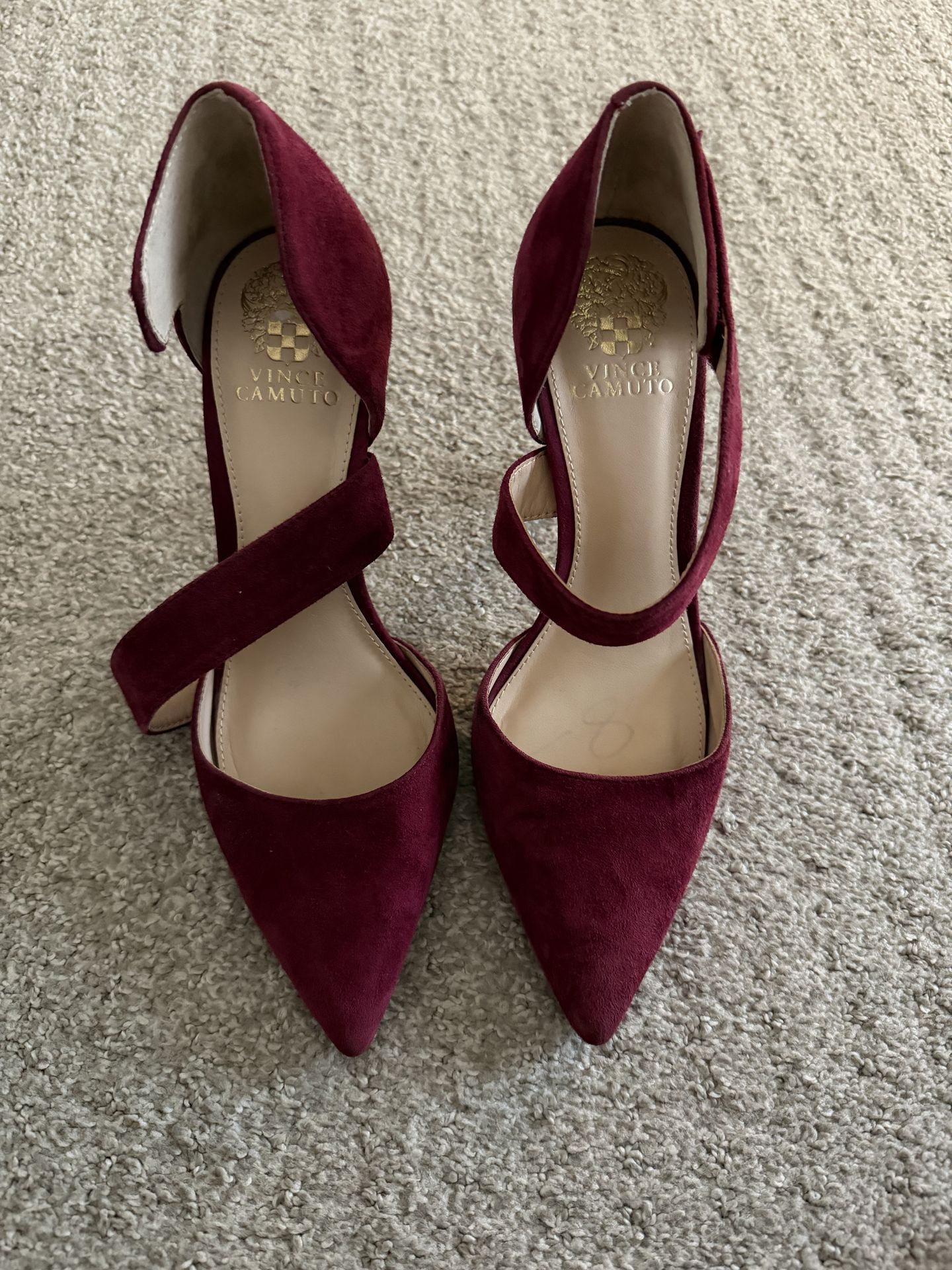 Elegant and timeless Vince Camuto burgundy suede heels in excellent condition. These chic pointed-toe pumps feature a flattering ankle strap design and a sleek stiletto heel, perfect for dressy occasions, weddings, date nights, or holiday events. The rich wine/burgundy suede adds a sophisticated pop of color while remaining versatile enough to pair with dresses, skirts, or tailored pants. The pointed toe silhouette creates a polished, elongating look, and the cushioned insole provides added comfort.