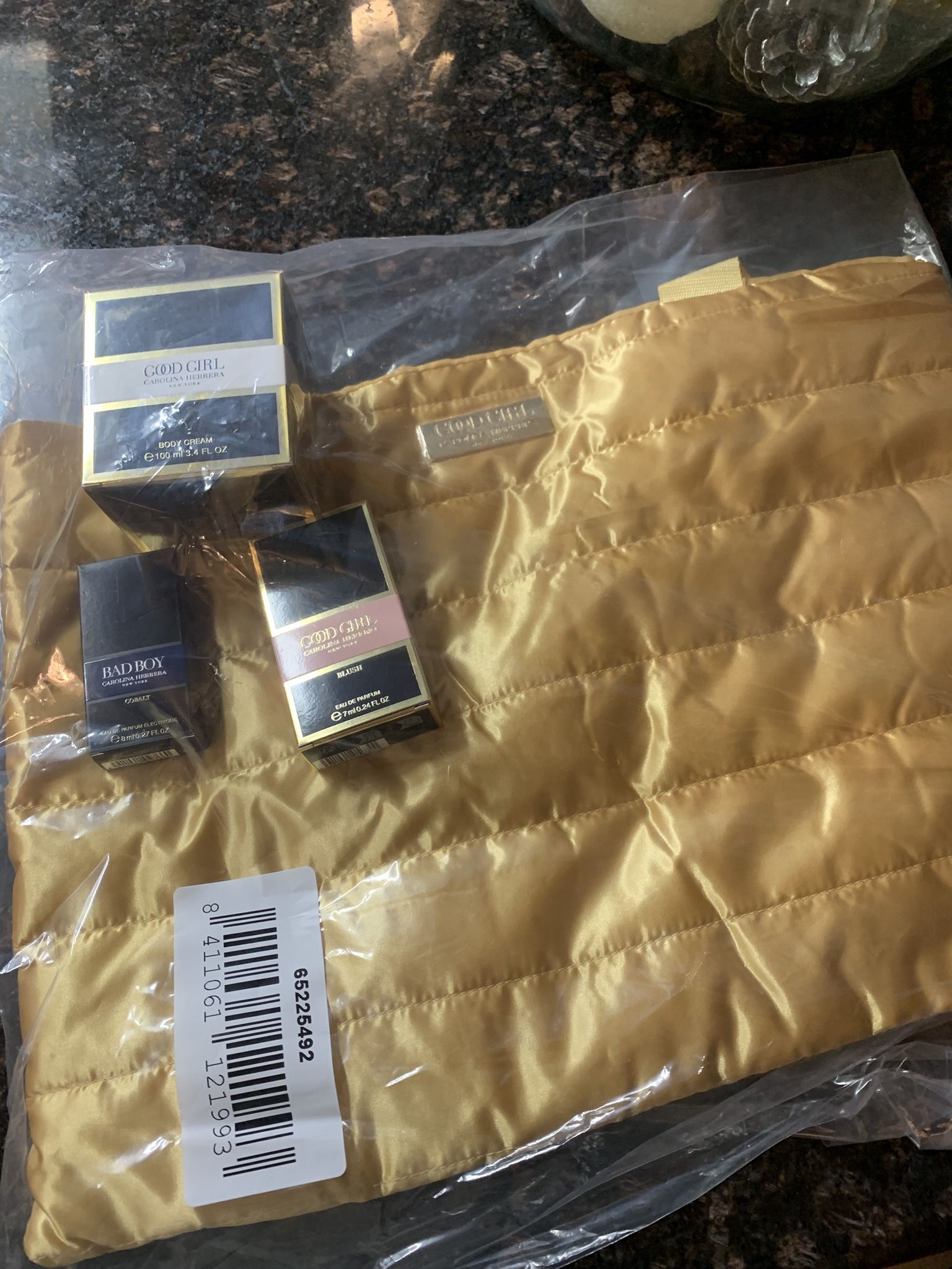 Comes with gold tote bag 3.4 oz body cream Bad boy colbalt cologne mini And a Good Gurl blush mini