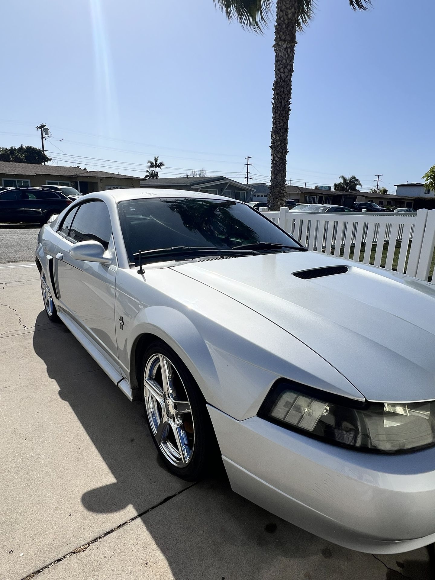 2003 Ford Mustang v6 Automatic Clean title 18” chrome wheels w/1.5” lowering springs Painted bumper, roof, and driver side Clean interior but 2 small rips in seat Upgraded sound system Rust on roof was removed and painted Open to trades