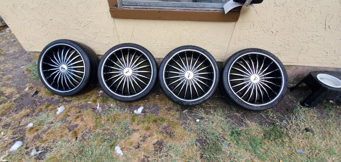 I have this set of 20 in rims whit almost brand new tires about 90% life on them..tires have no run out or damage like nails or air leaks .. just one rim has a little bit of damage but hold air in it can be easy fix at a rim repair shop . Tires are 225/35r20 ..all around has good grip U can upgrade to a bigger tire if u want sens the rim is still bigger then the tire ..there are like a 20x8.5 So u can go all the way to a 245 or 255 if u wanted All rims have the caps and screws This is a 5 lugnut universal fit for trucks or cars has 2 different offsets I can clean and detailed if bought Sens txt for more information tires are price at $115 a piece or $460 for the set plus tax And the rims and extra price 1 rim has just a little bit of side curbs scrash thats just because the rim is bigger then the tire just from the inside Asking $450 for the whole set comes whit everything