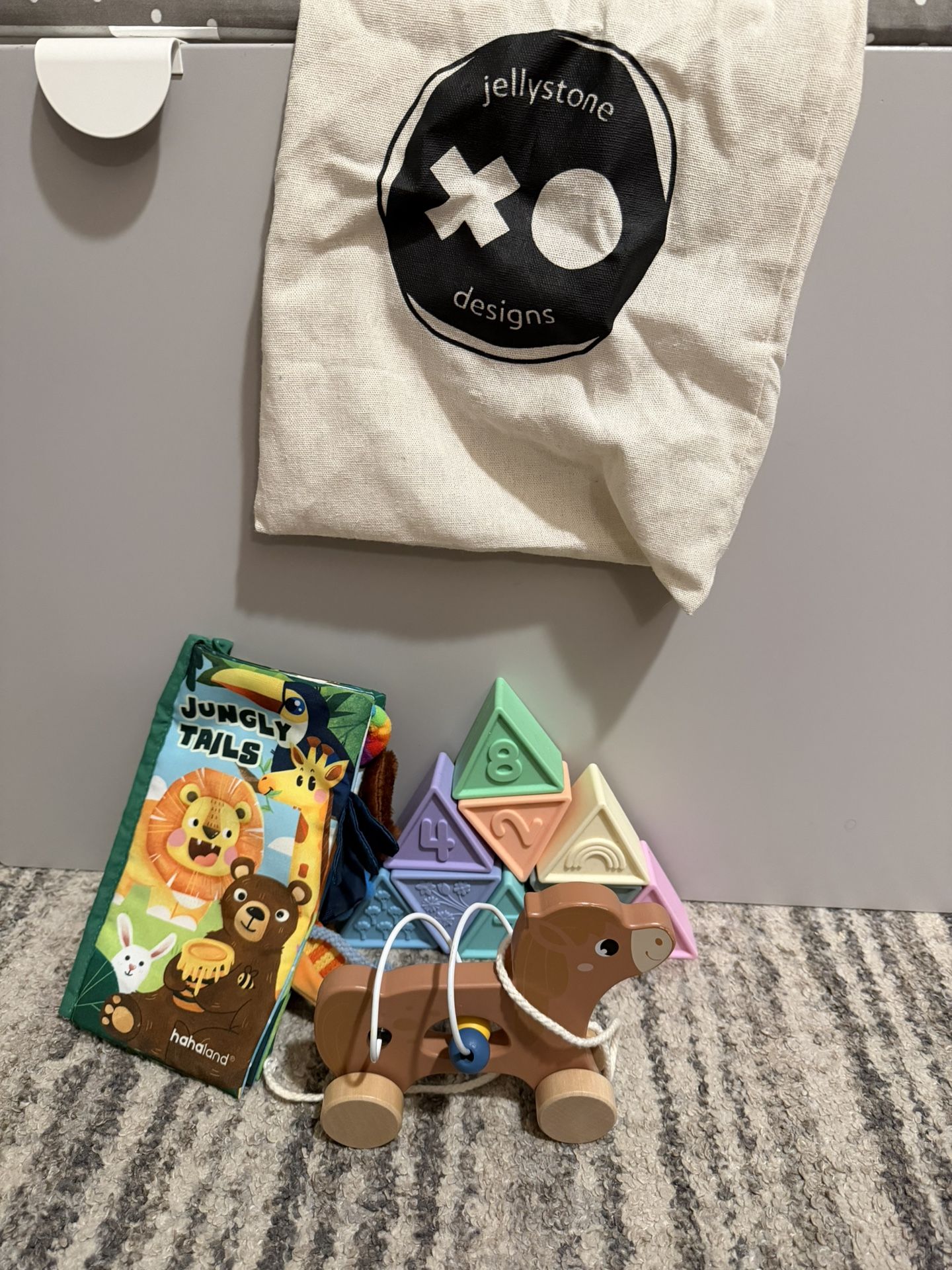 Moving sale ! Fun baby and toddler toy bundle! Hahaland Jungly Tails soft fabric book, has crinkly pages and different textures. Wooden horse pull toy with a bead maze on its back. Jellystone Designs stacking blocks are colorful, have numbers and shapes. Good for little ones to explore and play.