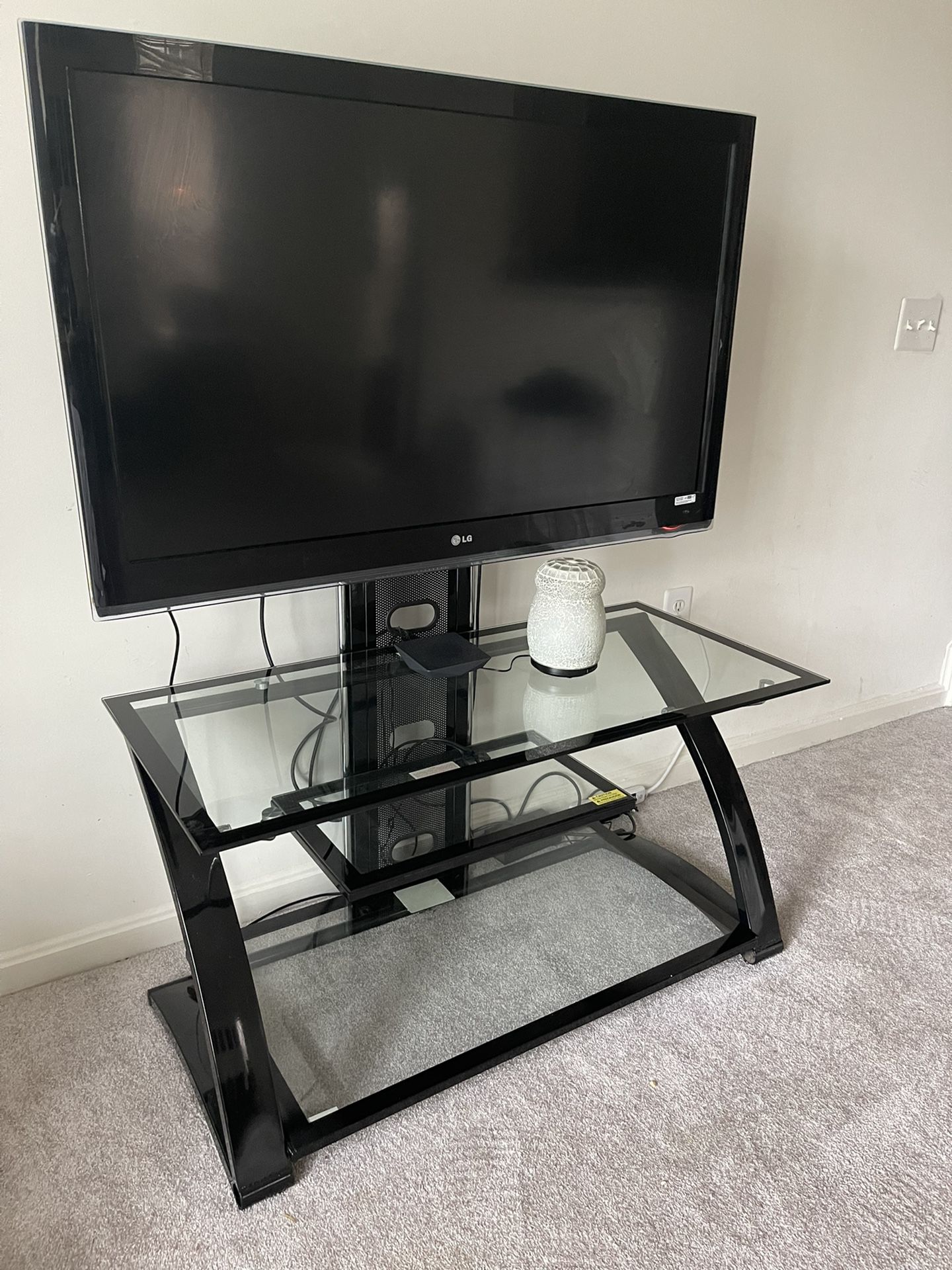 Glass 3 shelf TV stand. The tv mount is height adjustable and can swivel left & right.