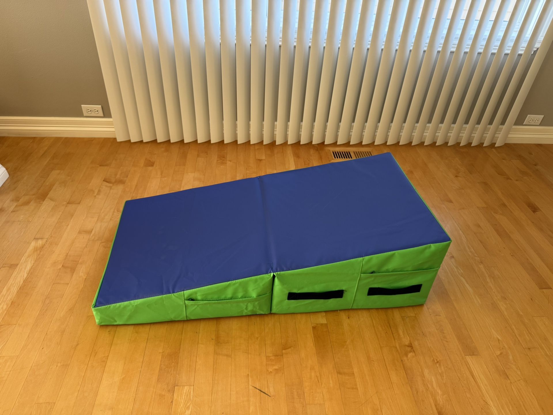 Durable folding gym mat in great condition. Looks brand new and purchased for more than $80. Folds flat for easy storage and has built-in handles for carrying. Perfect for home workouts, gymnastics practice, stretching, tumbling, martial arts, or kids’ play area. • Thick, supportive foam • Wipe-clean vinyl surface • Folds in half for compact storage • Carry handles on the side • Lightweight but sturdy