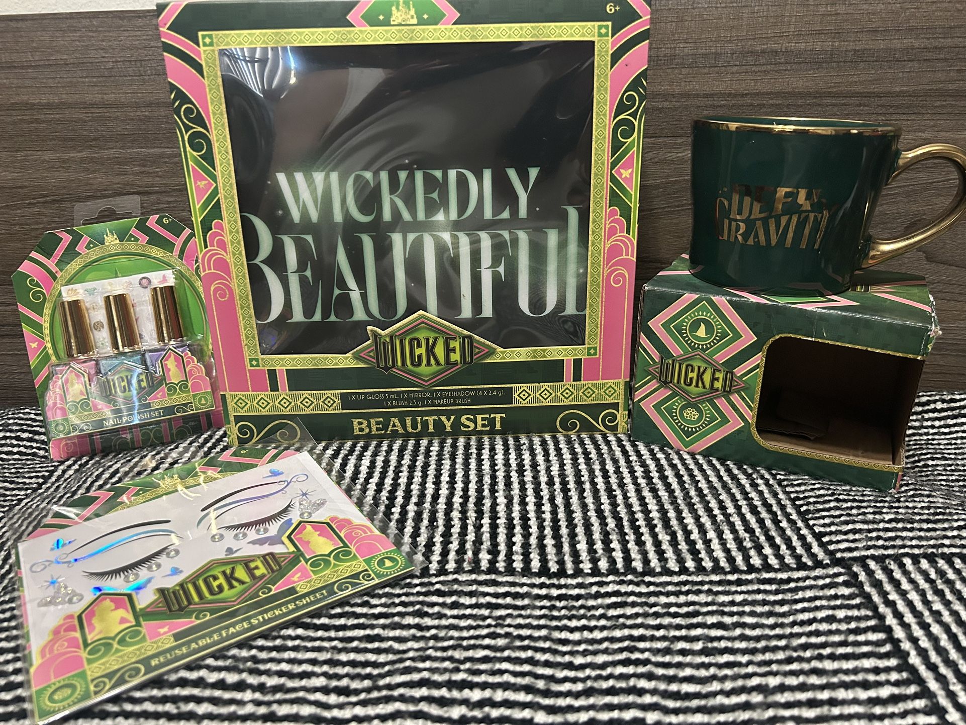 •Beauty set contains 1 lip gloss,1 mirror,1 eye shadow,1 brush, & 1 makeup brush •3 nail polish 4ml & nail sticker sheet •Reusable face sticker sheet •Wicked ceramic mug •Ages 6+