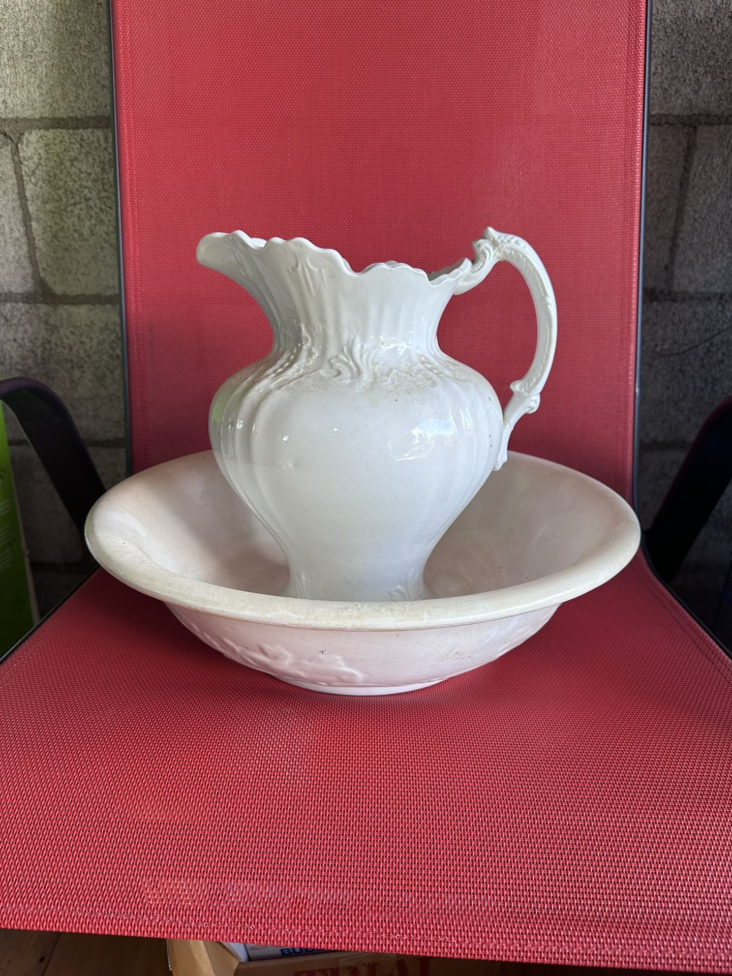 There’s a name on the bottom but I can’t read it. It says Se…. Porcelain It is very old and needs a good cleaning. The handle on the pitcher has been repaired. Make me an offer.
