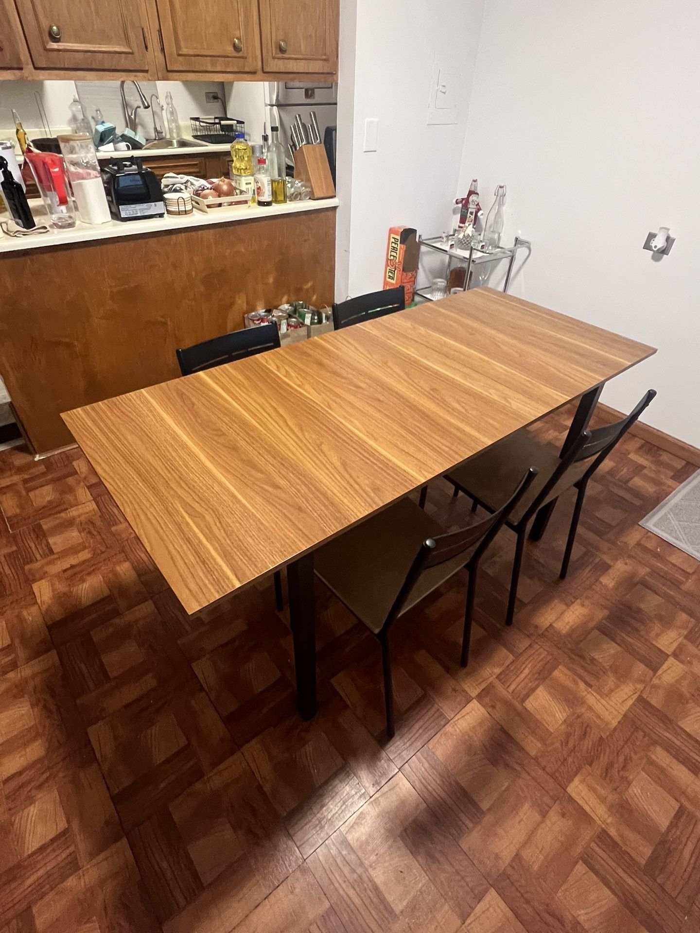 On sale dining table and 4 chairs. Very good condition, barely used. Text me for availability. Dimensions: 60 inches (47 without extender) x 27,5 inches wide x 30 inches (height)