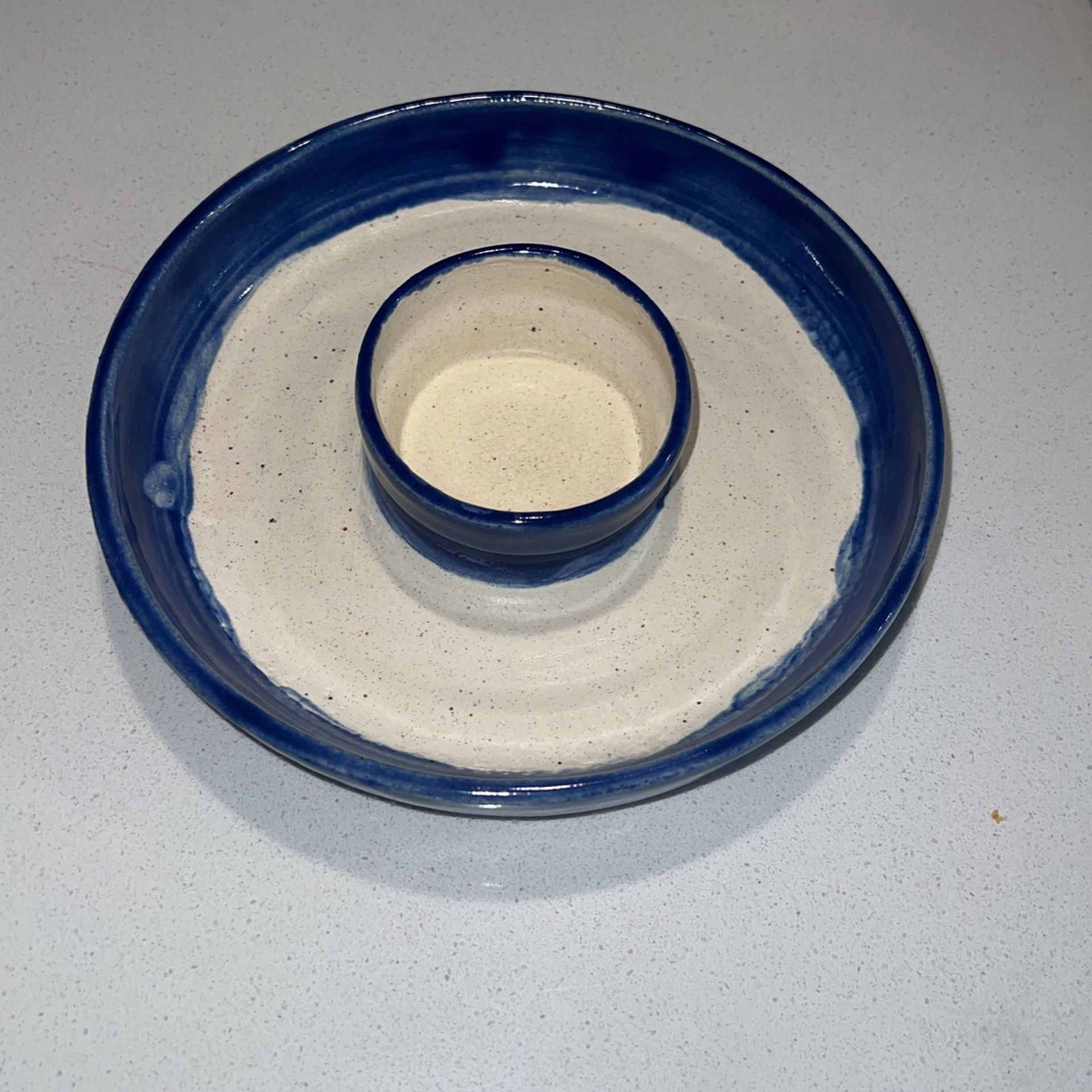 Handmade ceramic pit bowl. Inside is oatmeal white with blue outer edges.