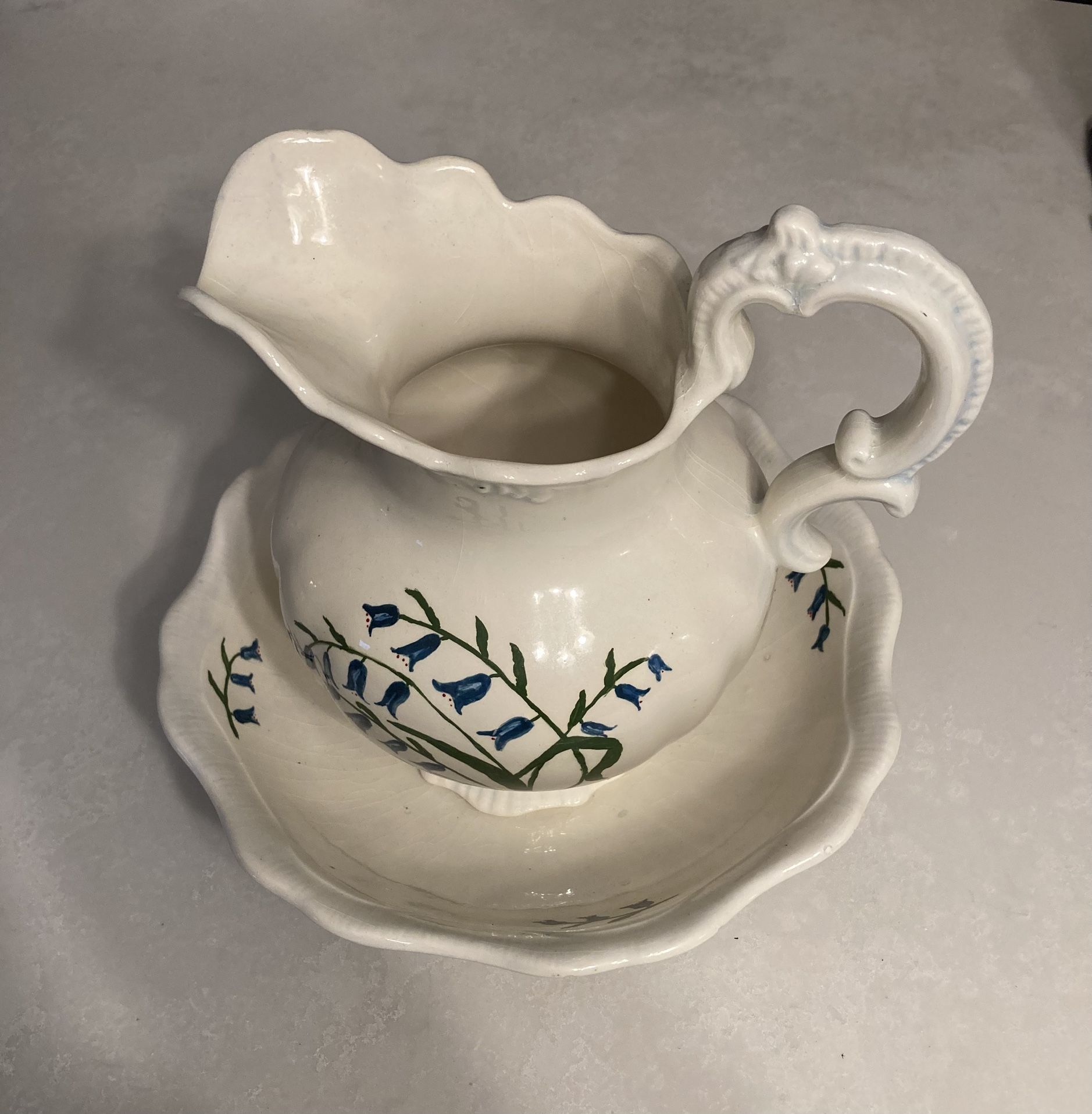 Will meet 3619 Pelham Rd Greenville SC (Lowes Foods) Cash only 1977 Vintage Pitcher and Basin set Bluebell pattern hand painted $15 obo