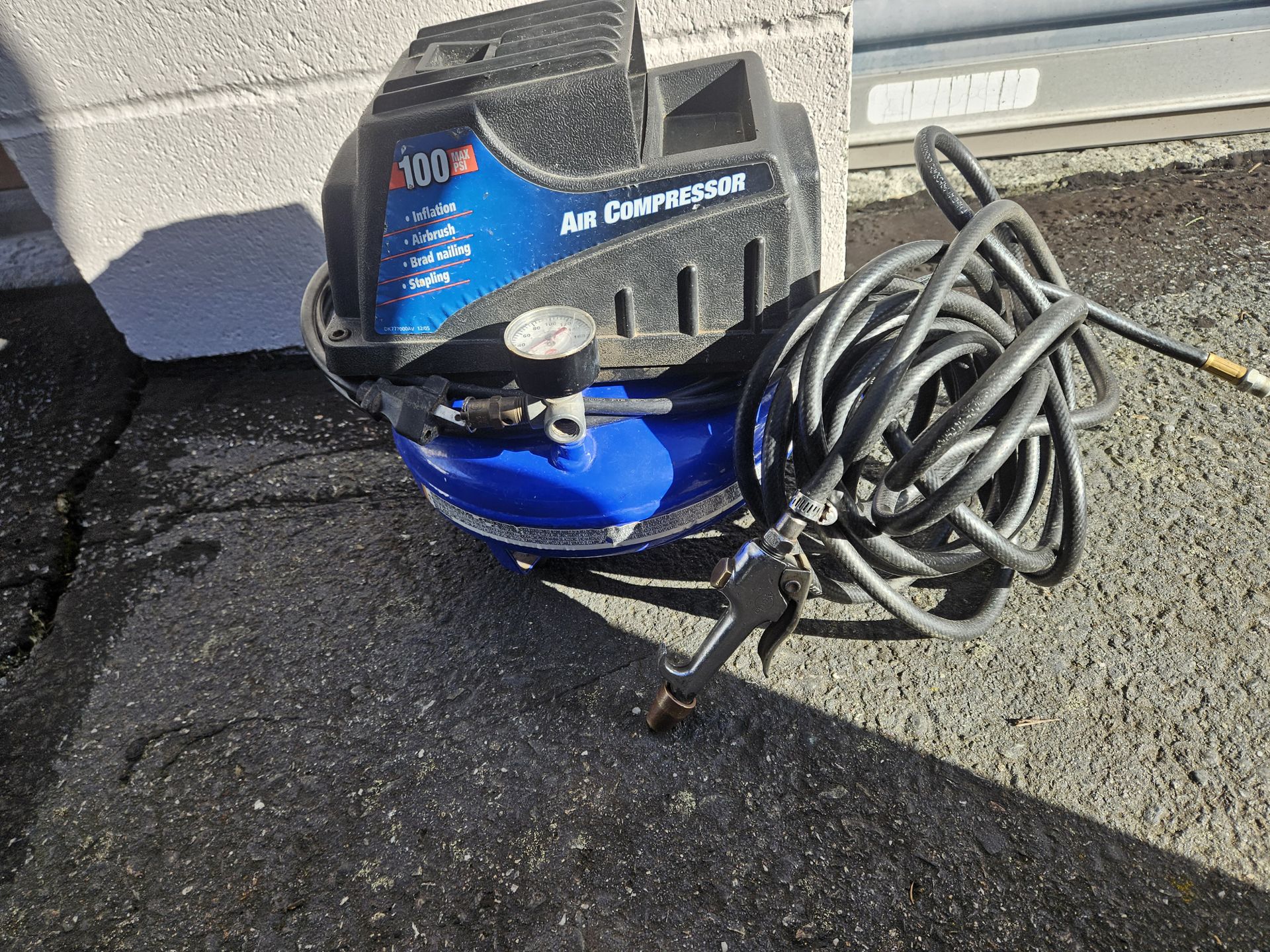 Campbell Hausfeld 1-Gallon Pancake Air Compressor, specifically identified by the "100" logo indicating its 100 PSI maximum pressure capacity. +2 Key Specifications & Features Model Identification: Often referred to by model number FP2028. Performance: Delivers a maximum working pressure of 100–110 PSI. Tank Capacity: Features a 1-gallon steel pancake-style tank. Pump Type: Utilizes an oil-free, maintenance-free pump. Power: Typically operates on standard 120V household power. Primary Uses: Designed for light-duty tasks listed on the unit's faceplate, including inflation, airbrushing, brad nailing, and stapling. Components Shown An integrated pressure gauge to monitor tank or output pressure. A large bundle of black air hose. A handheld inflation/blow gun attachment for directing airflow
