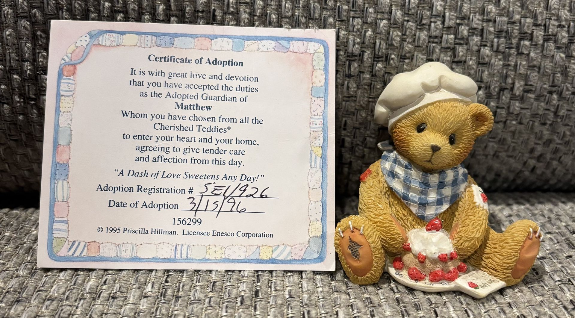 The figurine in the image is part of the "Cherished Teddies" collection, a line of collectible teddy bear figurines created by artist Priscilla Hillman. The specific figurine shown is named Matthew, item number 156299, introduced in 1995. Matthew is a chef bear with a strawberry shortcake. It is a hand-cast and hand-painted resin collectible. Comes in original box with certificate of adoption. Approximately Height: 2.75 inches (7 cm), Width: 2.5 inches (6 cm), Depth: 2 inches (5 cm)