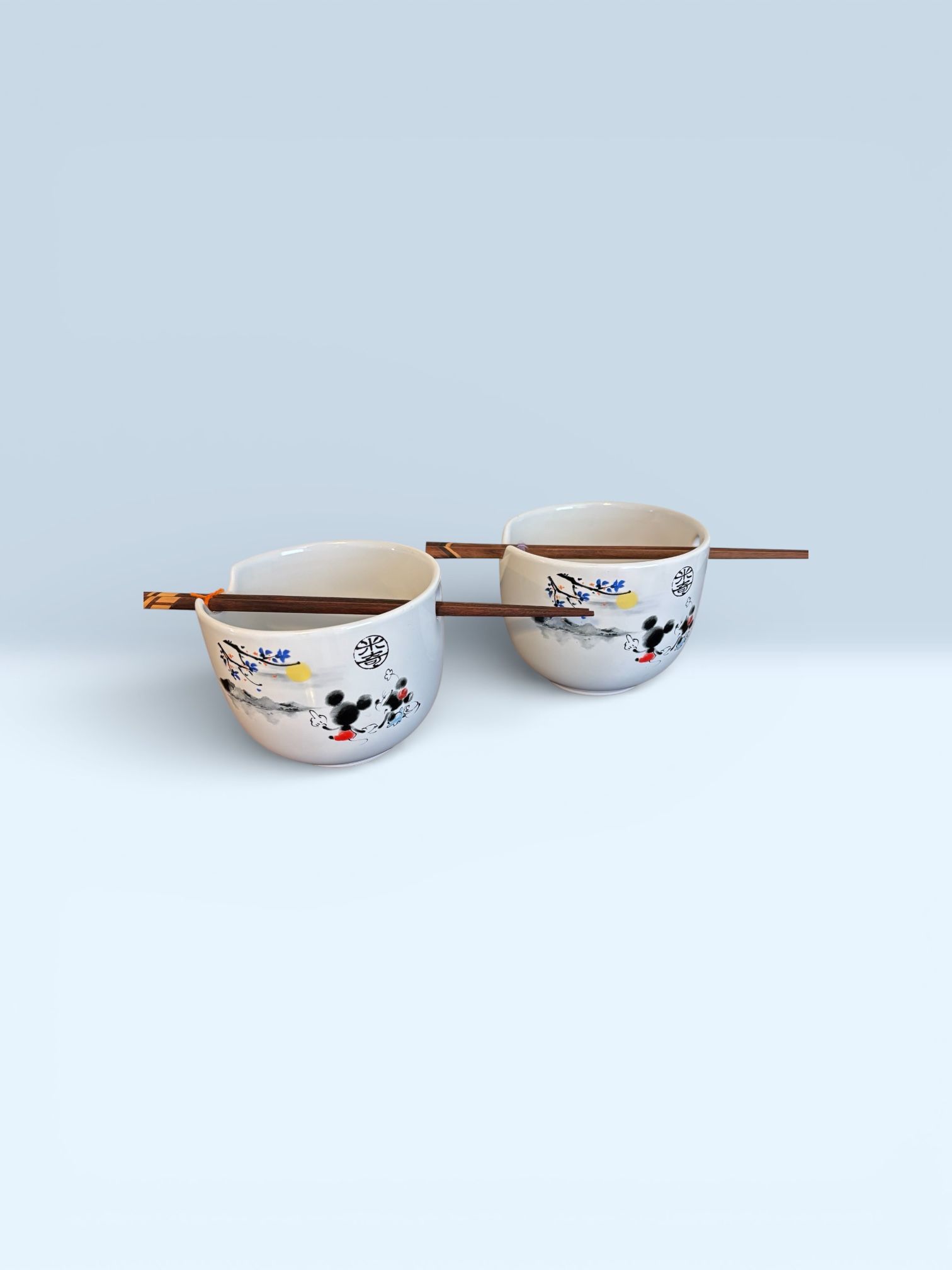 New…Two Silver Buffalo Disney Mickey & Minnie Watercolor Ramen Bowls . They are 20-ounce ceramic bowls featuring a watercolor design of Mickey and Minnie Mouse. • chopsticks are not included. • The bowl is both microwave-safe and dishwasher-