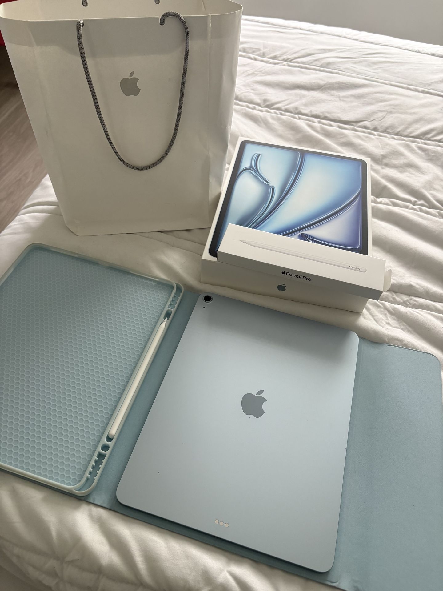 Selling a like-new Apple iPad Air 13-inch (M3 chip) 128GB bundle. The iPad is in excellent condition and works perfectly. This is a great bundle for students, artists, note-taking, or everyday use. Includes: • Apple iPad Air 13-inch (M3) – 128GB • Apple Pencil Pro (2025) • Screen protector (already installed) • Protective iPad case *No charger Everything is fully functional and well cared for. No scratches or damage. Ready to use immediately.