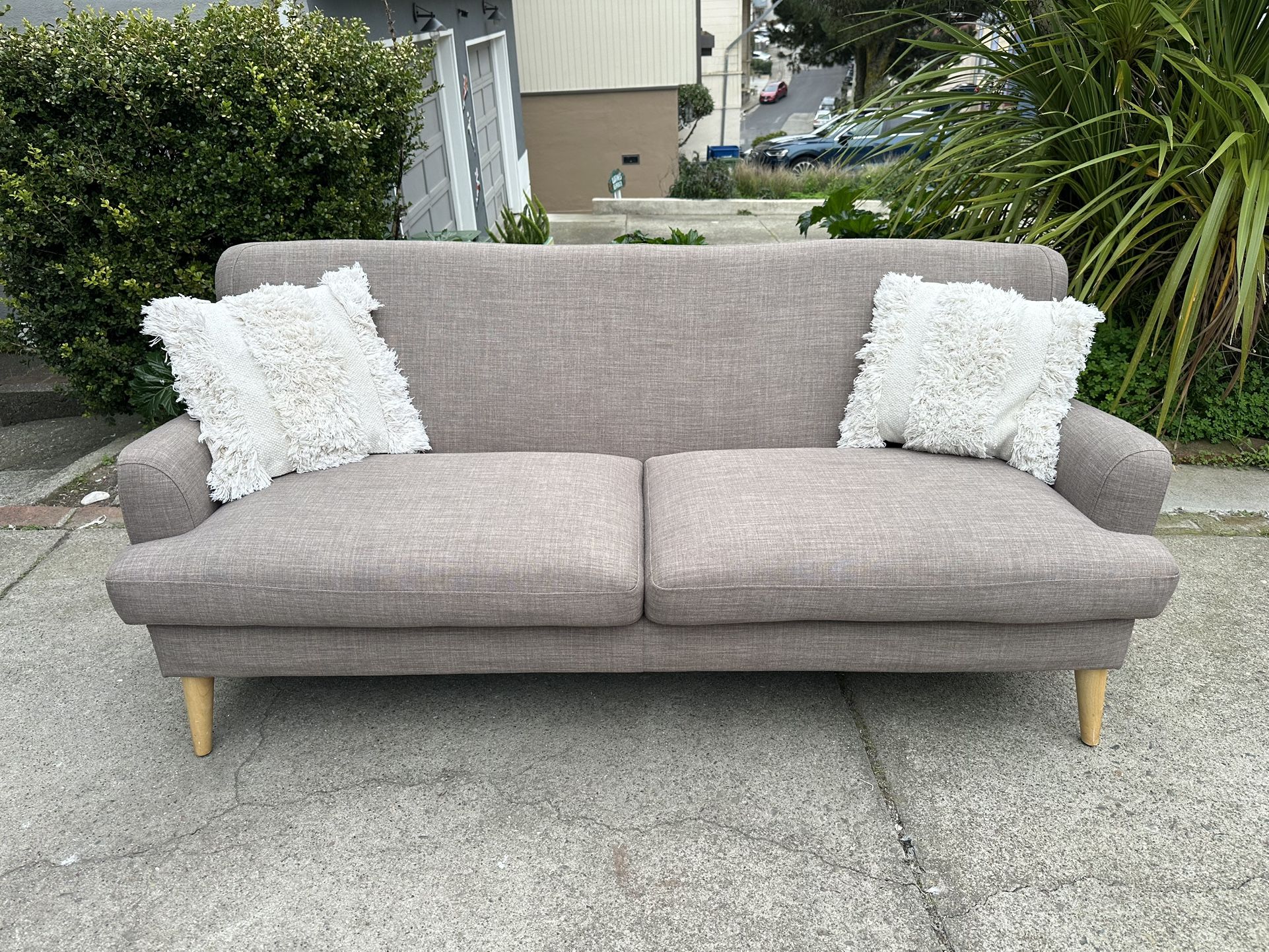 Great light brown loveseat couch in good condition! Cleaned and washed. No stains(Pillows not included). Dimensions: 74"W x 32"D x 33"H Free delivery within 10 miles. (Note: Free delivery is to the door of the house or building, if you need help to enter it, we do it for an extra charge).