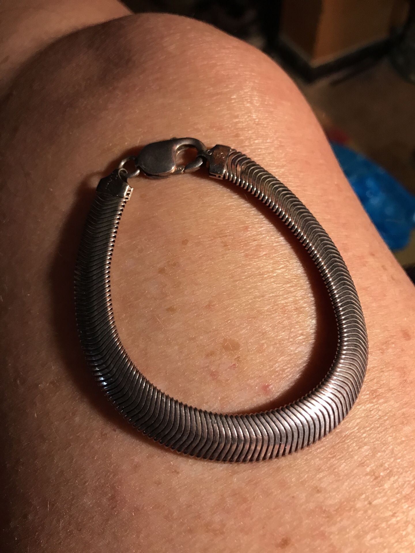 This bracelet is Italian sterling silver and it is solid! It’s a quarter inch snake flat link that is very rare to find! It needs a little polishing but it’s never been worn
