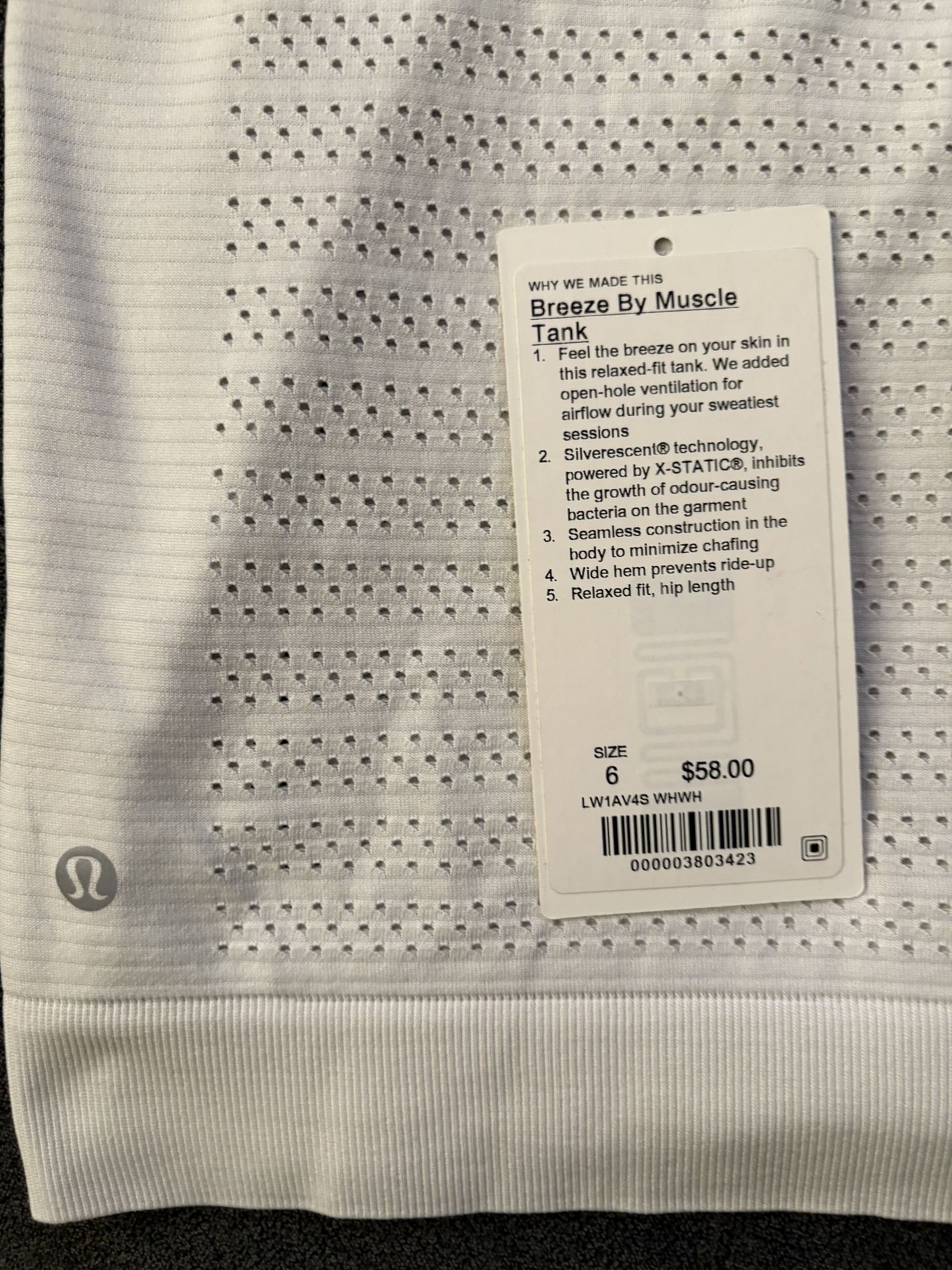 Breeze By Muscle Tank, White, Size 6 This is gently used, no rips or tears. Comes from a clean, smoke free home. Retails $58 Asking $ 15