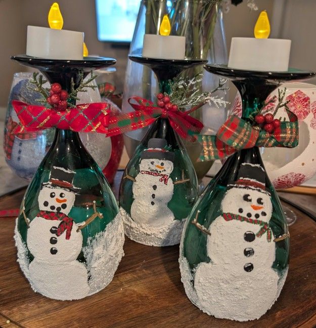 These cute candle holders were upcycled from three green goblets. Hand painted and decorated.