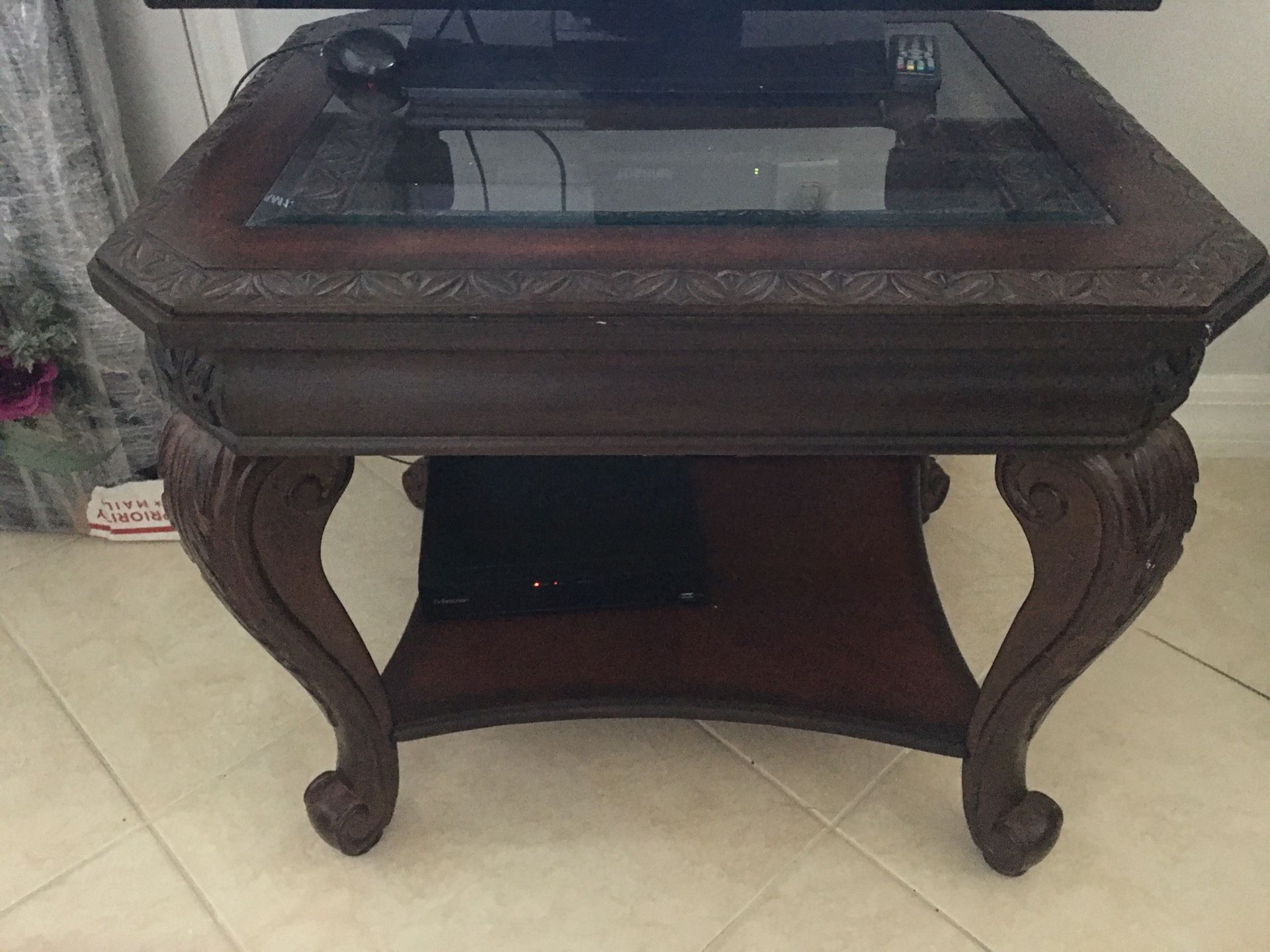 Living room end table. Dark wood with glass top.