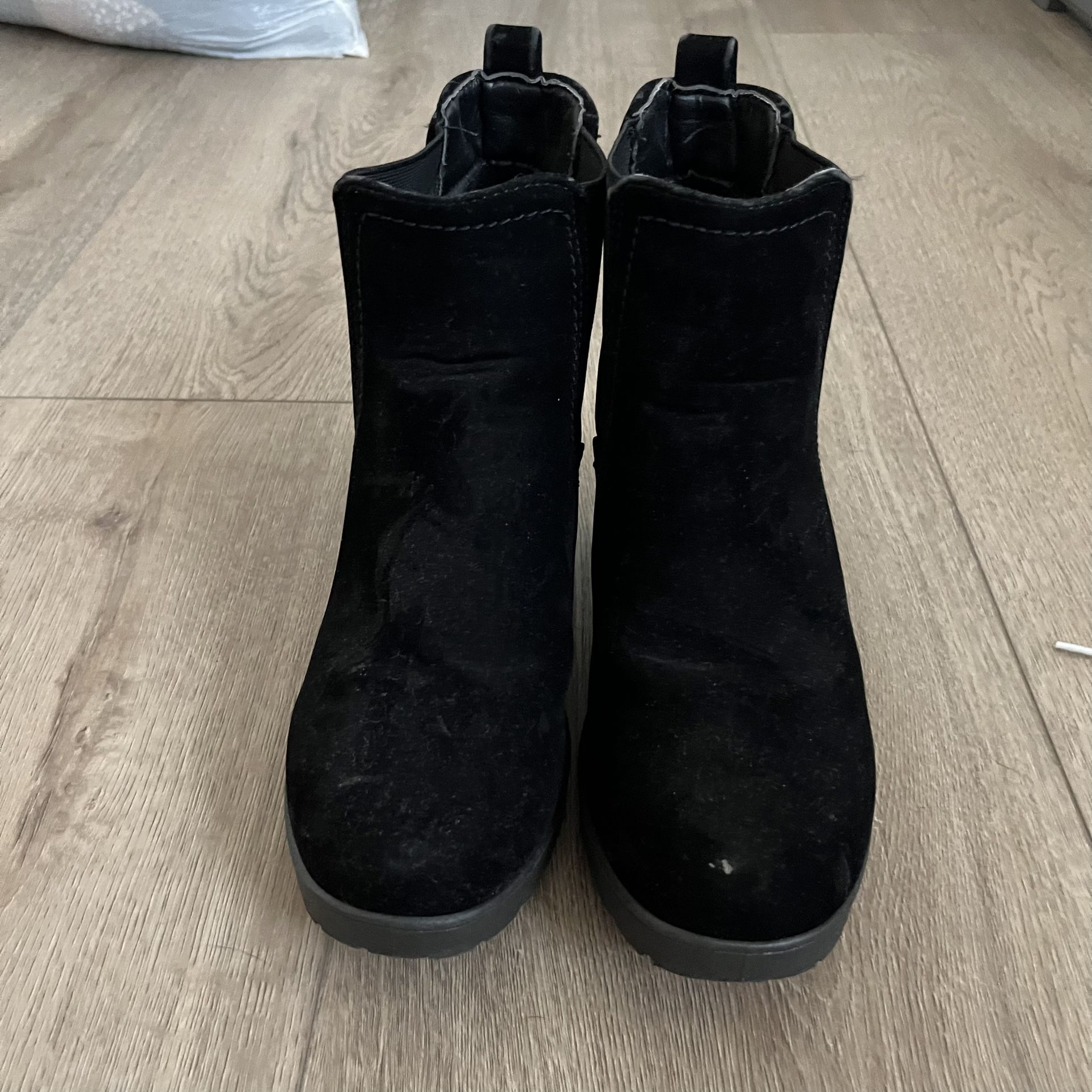 Used but in good condition. Tiny scuff on the front toe. Black velvet booties