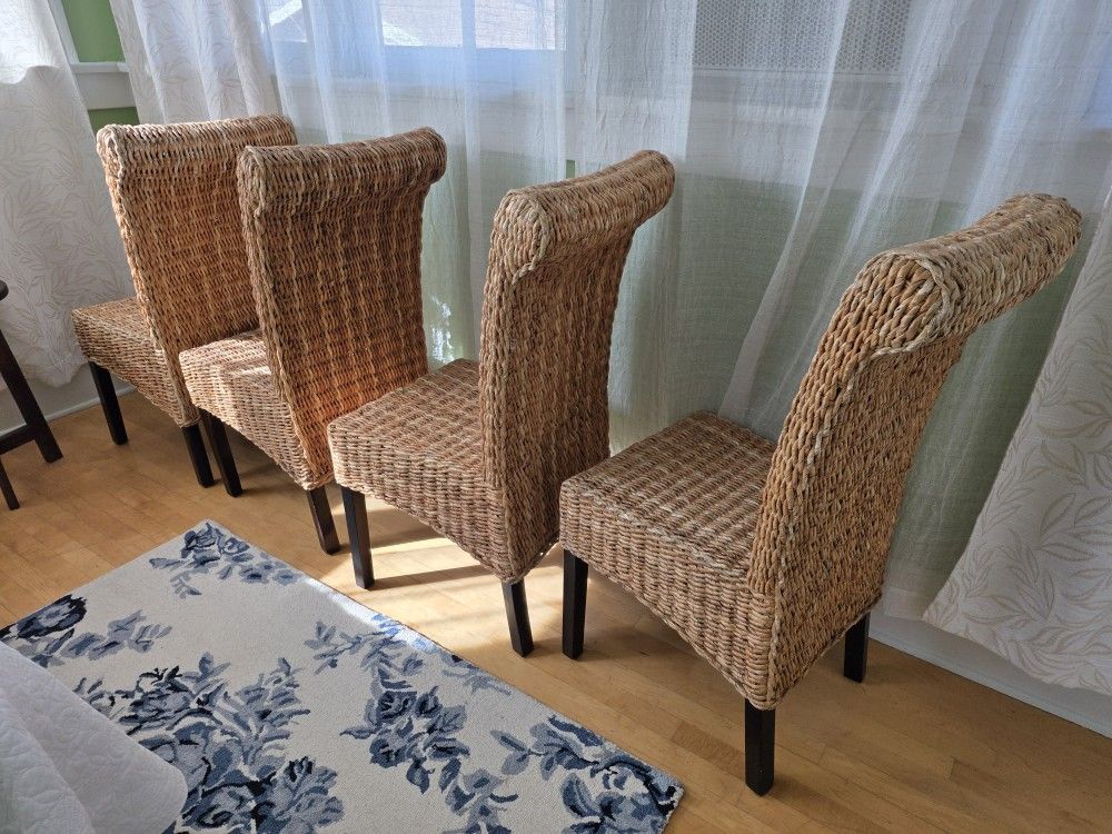 Set of 4 chairs. Good condition. Some normal wear and tear. L: 41.5 inches W: 19.5 inches There are 2 more matching chairs that we're willing to sell with your best offer for the set of 6 chairs. Pick-up only.