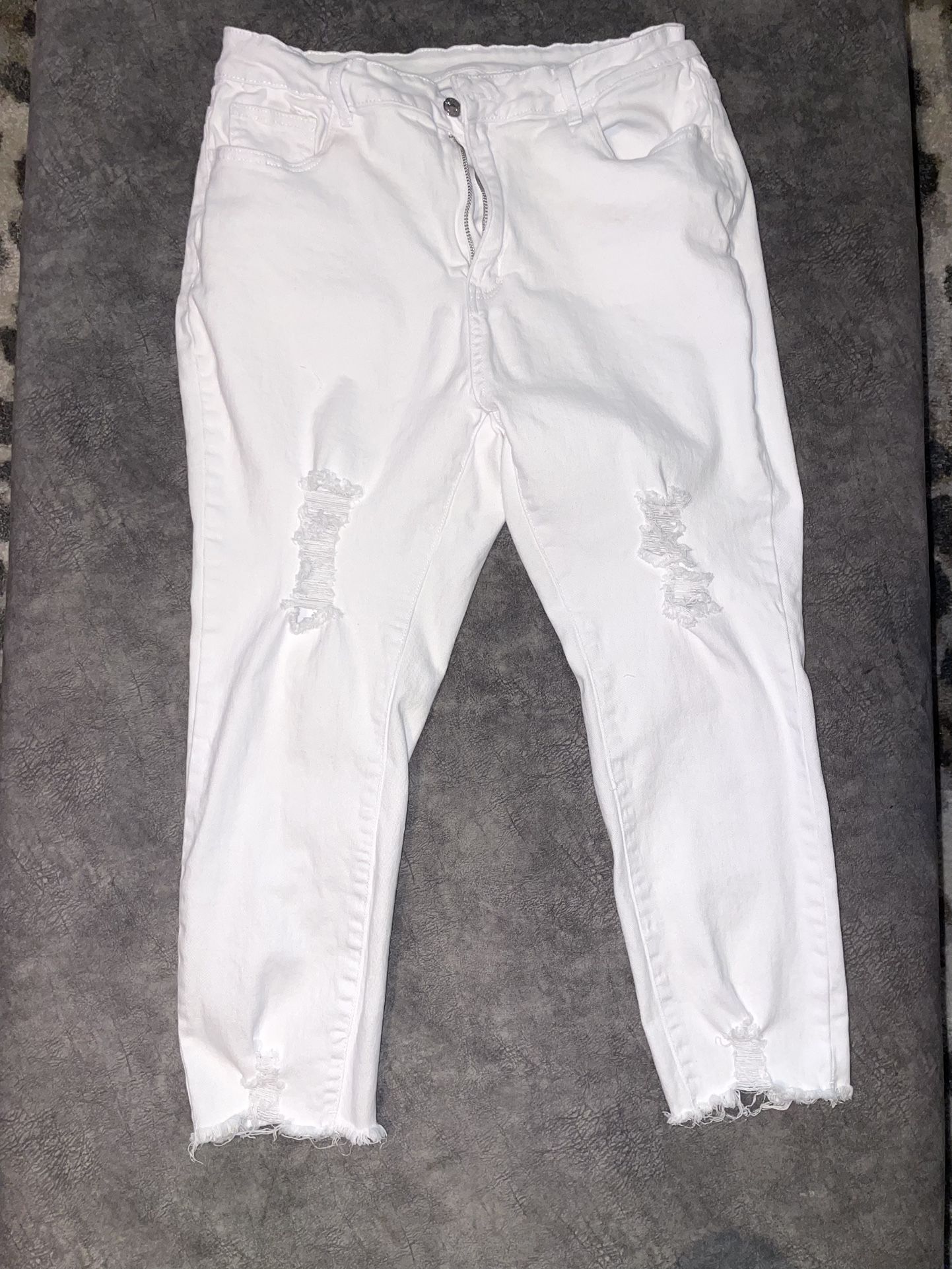 SHEIN White Distressed Ankle Jeans Size XL Trendy white jeans with distressed details. Perfect for casual style. 19th ave and southern