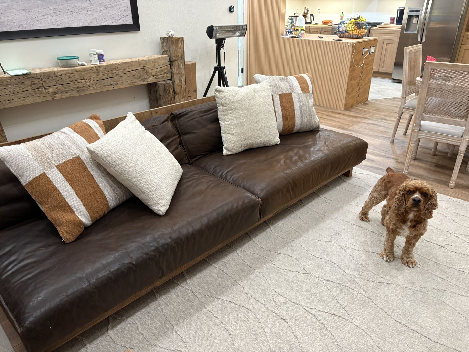 Beautiful RH Modern Oak Brûlé Sled Leather Sofa in great used condition. Features rich brulée-toned genuine leather with a solid oak sled base. Sleek, low-profile modern design that’s both comfortable and stylish. High-end RH craftsmanship — very sturdy, deep seating, and extremely comfortable. Leather has natural patina consistent with quality leather, no rips or tears. Originally retailed for several thousand dollars. Selling at a fraction of the original price. Details: • Genuine RH Modern leather • Solid oak sled base • Deep, comfortable cushions • Modern / minimalist style Condition: Gently used Pickup only 9-Foot Sofa (approx 108″) • Overall Width: 108″ • Depth: ~41¾″ • Height: ~28″ • Seat Height: ~17″ Message me if interested!