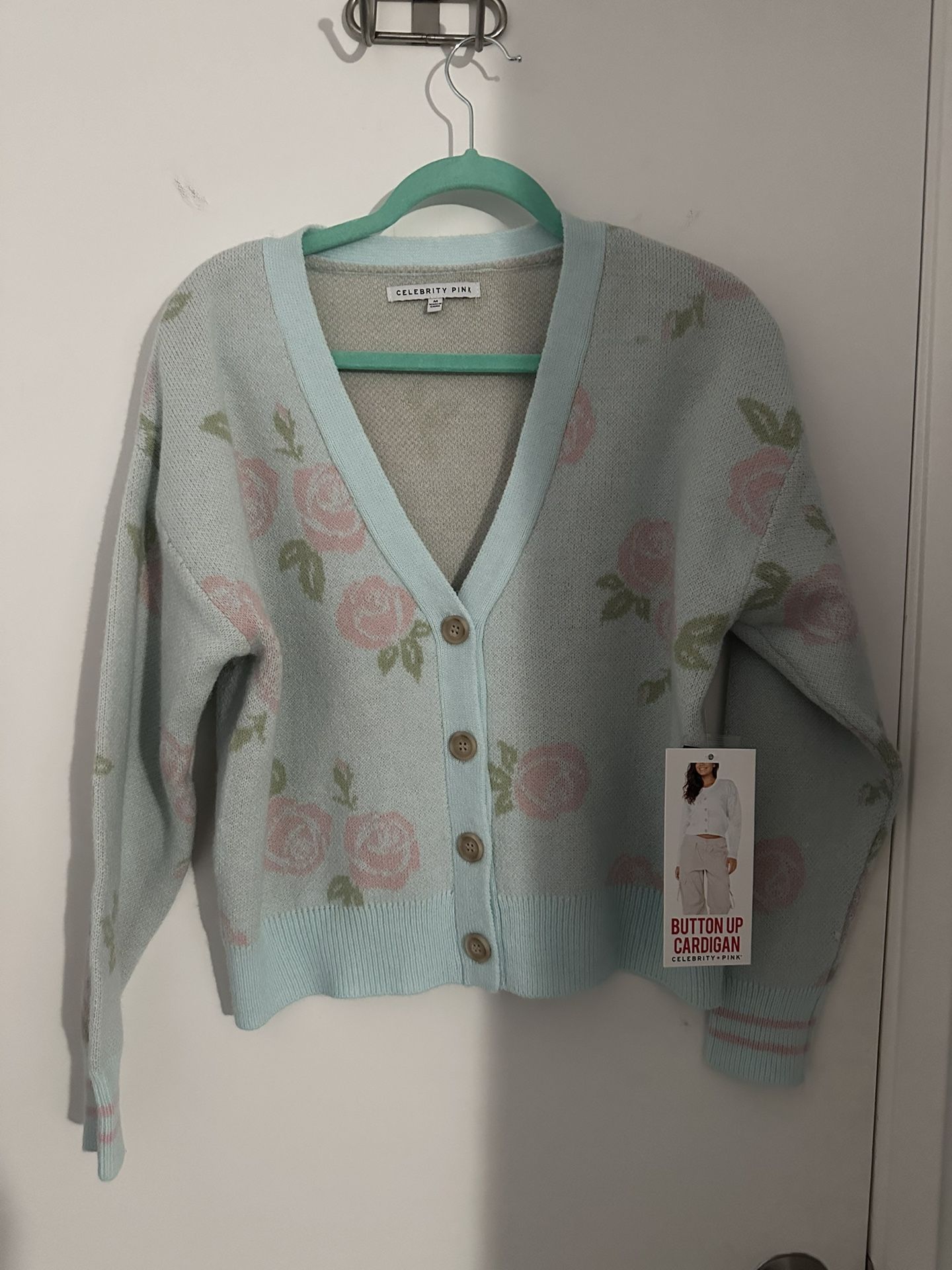 πΈ Brand New Celebrity Pink Rose Cardigan β M! πΈ Adorable pastel blue cardigan with all-over pink rose pattern. Features a flattering V-neck, wooden-style buttons, ribbed cuffs, and a comfy, slightly cropped fit. Super soft and perfect for cozy outfits! New with tags + extra button.