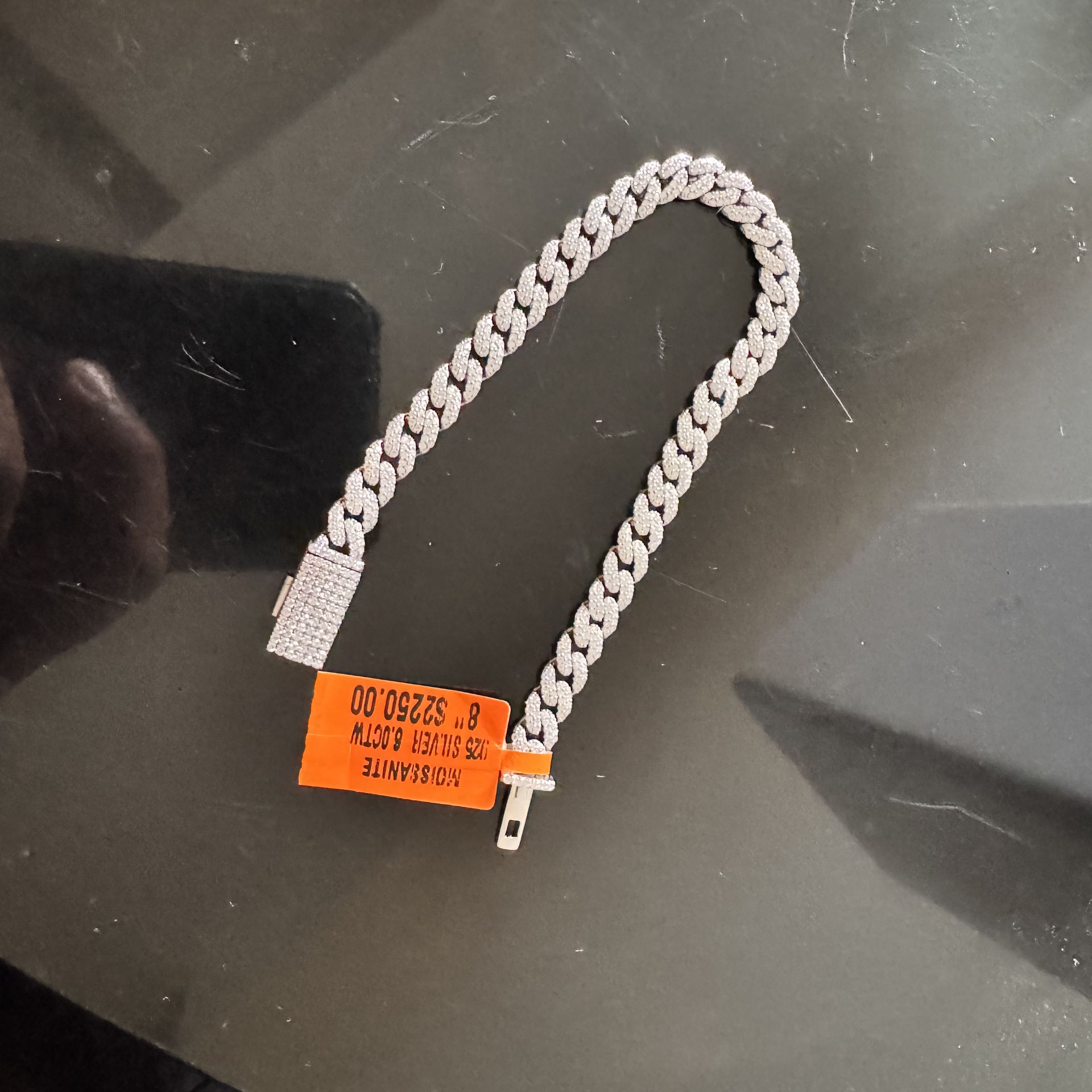 Heavy solid sterling silver (925) Cuban link bracelet. This is NOT plated or stainless — real silver weight at 21 grams with a clean 6mm link size that gives a strong but classy look. Features a fully iced-out box clasp for that luxury bustdown style. Shines crazy in the light and sits perfect on wrist. Perfect everyday piece or stacked with a watch. Specs: • Length: 8 inches • Width: 6mm • Weight: 21 grams • Metal: Solid 925 Sterling Silver • Clasp: Iced box clasp • Condition: Excellent